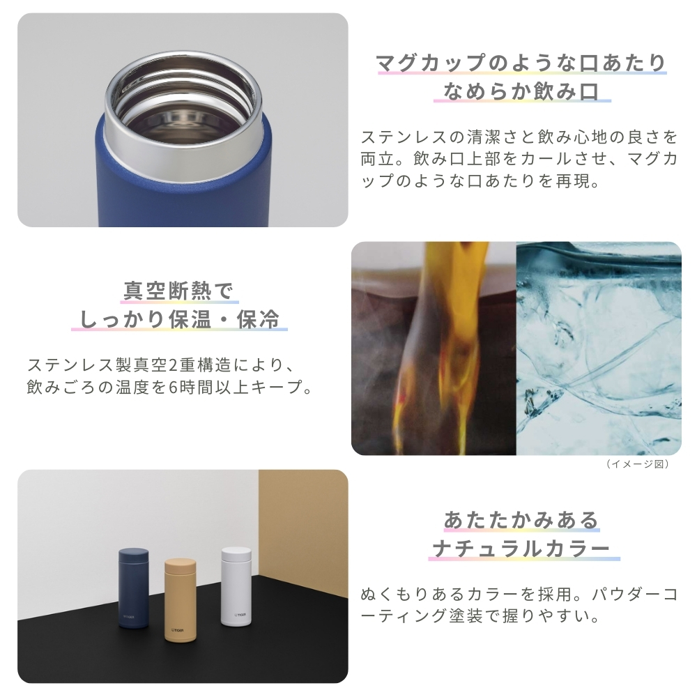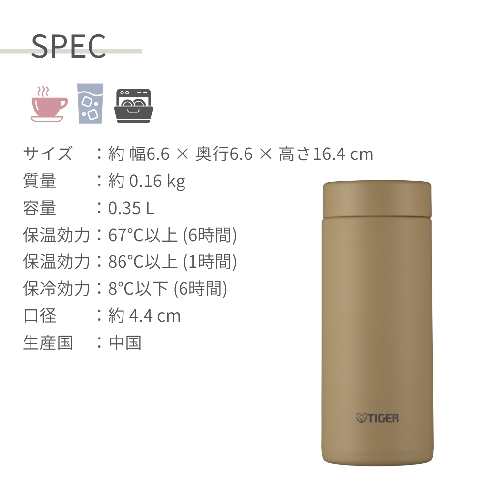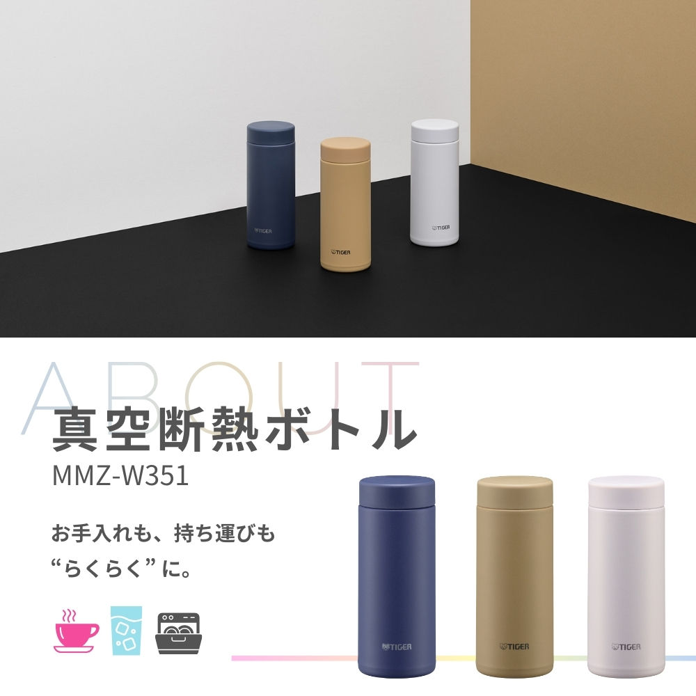 | 商品名: タイガー魔法瓶 真空断熱ボトル MMZ-W351 350ml 保温 保冷 パッキン一体型 スクリュー マグ マグボトル 食器洗い乾燥機対応 軽量 スポーツドリンク ステンレス スリム 直飲み 夢重力ボトル -商品説明- お手入れも、持ち運びも“らくらく” に。 「洗いやすいパッキン一体型せん」 &「食器洗い乾燥機OK」でお手入れがらくらく! パッキンの着脱をしなくてもいいから、つけ忘れやつけまちがい、紛失の心配いらず。 真空断熱ボトル MMZ-W351 -----お手入れ“らくらく”簡単キレイ----- ボトルキャップ(せん)は1パーツのシンプル構造でお手入れ簡単、さらにボトルまるごと食器洗い乾燥機OK。 洗いやすさにこだわったらくらくキャップ パッキンとせんが一体化した「らくらくキャップ」で手間なく洗えます。 パッキン部分は露出していてスポンジが当たりやすくお手入れしやすい構造です。 食器洗い乾燥機OK せん・本体ともに食器洗い乾燥機に対応。 お手入れがさらにらくになりました。 ※せんと本体ははずして入れてください。 汚れやにおいがつきにくく、サビにも強いスーパークリーンPlus(プラス) ボトルの内面には、なめらかで光沢のあるスーパークリーンPlusを施しました。汚れ・においがつきにくく、サビにも強いので、塩分が含まれているスポーツドリンクを入れてもOK。 ※使用後はすぐに水ですすぐなど、お手入れしてください。 -----持ち運び“らくらく” 魔法をかけたような軽さ!----- 夢重力(むじゅうりょく)ボトル パッキン一体型せん搭載のスクリューマグボトルにおいて最軽量※。 ※2024年8月6日時点 国内パッキン一体型せん採用のスクリューマグボトルにおいて、同容量製品と比較した場合。(当社調べ) 独自のスピニング加工により軽量化を実現 当社独自のスピニング加工により軽量化を実現。 かばんにもすっぽり入るスリムマグタイプ。 0.35Lサイズは約160gと軽量なので、持ち運びがラクにおこなえます。 ・マグカップのような口あたり なめらか飲み口 ステンレスの清潔さと飲み心地の良さを両立。飲み口上部をカールさせ、マグカップのような口あたりを再現。 ・真空断熱でしっかり保温・保冷 ステンレス製真空2重構造により、飲みごろの温度を6時間以上キープ。 ・ナチュラルでモダンなカラー 少し大人なモダンカラーを採用。 幅広い層の方に使いやすい中間色で展開。 パウダーコーティング塗装で握りやすい。 -特徴・品質- ・スーパークリーンPlus加工により、汚れやにおいがつきにくく、サビに強い。 ・約160gの軽量設計で、持ち運びが簡単。 ・ステンレス製真空二重構造で、高い保温・保冷効果を提供。 -仕様- ・カラー:オフホワイト、イエローオーカー、ネイビーブルー ・容量:0.35L ・保温効力(6時間):67℃以上 ・保温効力(1時間):86℃以上 ・保冷効力(6時間):8℃以下 ・サイズ:(約)幅6.6×奥行6.6×高さ16.4cm ・質量:(約)0.16kg ・口径:(約)4.4cm ・生産国:中国 ※ 保温効力とは、室温20度±2度において、製品に熱湯を満たし、縦置きにした状態で湯温が95度±1度の時から1時間および6時間放置した場合におけるその湯の温度です。 ※ 保冷効力とは、室温20度±2度において、製品に冷水を満たし、縦置きにした状態で水温が4度±1度の時から6時間放置した場合におけるその水の温度です。 -機能- ・パッキン一体型の「らくらくキャップ」で、パーツの紛失やつけ忘れの心配なし。 ・本体とせんは食器洗い乾燥機対応で、お手入れが簡単。 ・マグカップのような飲み口で、快適な飲み心地を提供。 -使用・手入れについて- 本体とせんは食器洗い乾燥機に対応していますが、必ず分解してから洗浄してください。使用後は、スポーツドリンクなどを入れた場合はすぐに水ですすいでください。 -注意事項- ・商品の色はできる限り実物に近づけていますが、ディスプレイ設定や撮影条件により色味が異なる場合があります。ご了承ください。 ・ご注文のタイミングや内容により、購入後のキャンセルや修正が制限される場合があります。 ・同時に複数のご注文があった場合、システム上の遅延により在庫がないにも関わらず購入できてしまう場合があります。そのような場合は速やかにメールでお知らせいたします。 |