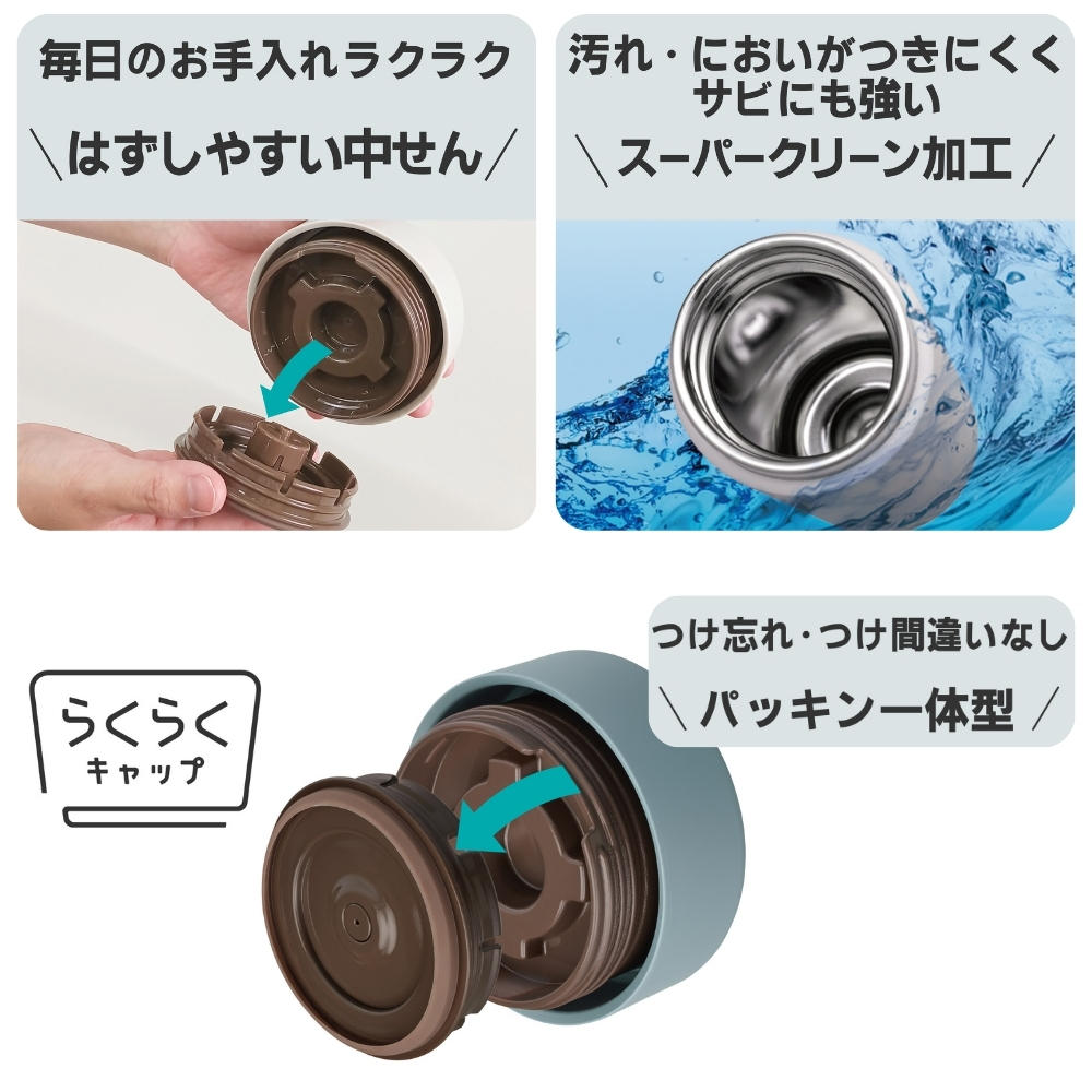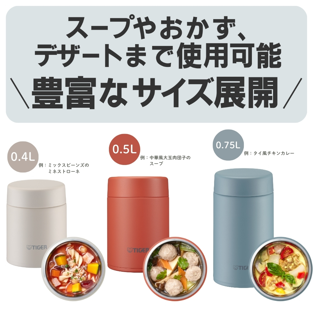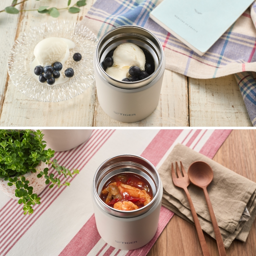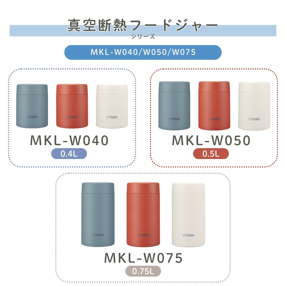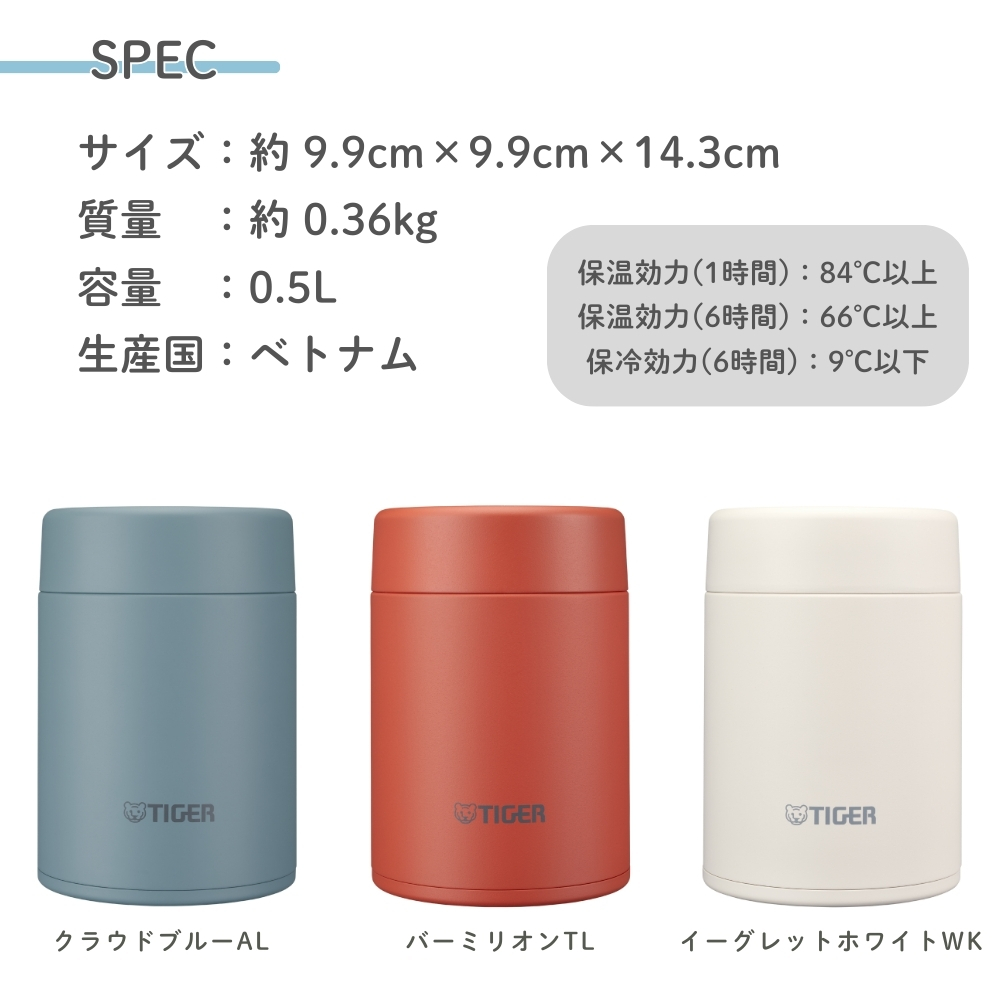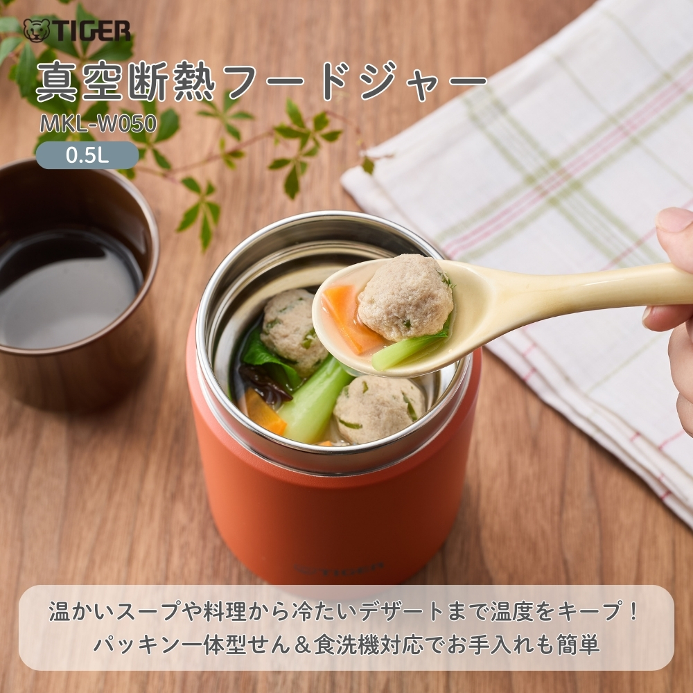 | 商品名: タイガー魔法瓶 真空断熱フードジャー MKL-W050 スープジャー 500ml 保温 保冷 ステンレス 広口 小さめ 洗いやすい 食洗器対応 真空断熱 お弁当 ランチジャー カレー デザート スープ用 -商品説明- 真空断熱フードジャー MKL-W050 温かいスープや料理から冷たいデザートまで温度をキープ! パッキン一体型せん&食洗機対応でお手入れも簡単 ----- 400mLから750mLまで豊富なサイズ展開 ----- スープから具材の大きな料理まで、様々なメニューが入れられる真空断熱フードジャー。 ランチからアウトドアまで、あらゆるシーンで一年中活躍します。 ※こちらの商品ページは0.5Lになります ☆☆☆ メニューに合うおすすめサイズ ☆☆☆ 0.4L(MKL-W040)…スープ・汁物 0.5L(MKL-W050 ) … 具材の大きなスープ、お粥など 0.75L(MKL-W075 ) … 麺類、カレー、丼ものなど ----- 広口の口径 ----- 口径約7.0cmの広口で、大きな具材が取り出しやすく食ベやすくなっています。 ----- なめらか飲み口 ----- ステンレスの清潔さと飲み心地の良さを両立させた、なめらか飲み口。 飲み口上部をカールさせることで、マグカップのような口あたりを再現しました。 ----- パッキン一体型せん「らくらくキャップ」 ----- せんとパッキンが一体になった「らくらくキャップ」搭載。 パッキン着脱の必要がなく、パッキンのつけ忘れやつけまちがい、紛失の心配もありません。 ----- ワンタッチ着脱せん ----- ワンタッチでかんたんに外せるせん構造で、使用後のお手入れのストレスが少なく、360度どの方向からもセットできます。 ----- 食器洗い乾燥機 OK ----- 中せん・本体ともに食器洗い乾燥機に対応。 お手入れがさらにらくになりました。 ※せんと本体ははずして入れてください。 ----- 汚れやにおいがつきにくい「スーパークリーン加工」 ----- カップの内面には、なめらかで光沢のあるスーパークリーン加工を施しました。 汚れもニオイもつきにくく、さっと洗うだけでいつでも清潔です。 ※使用後はすぐに水ですすぐなど、お手入れしてください。 ----- 真空断熱でしっかり保温・保冷 ----- ステンレス製の真空二重構造により、高い保温・保冷効力を実現。スープや料理を温かい状態で、デザートを冷たい状態で持ち運ぶことができます。 ※保温効力とは、室温20度±2度において、製品に熱湯を満たし、縦置きにした状態で湯温が95度±1度の時から1時間および6時間放置した場合におけるその湯の温度です。 ※保冷効力とは、室温20度±2度において、製品に冷水を満たし、縦置きにした状態で水温が4度±1度の時から6時間放置した場合におけるその水の温度です。 -特徴・品質- ・スープやデザートにぴったりの400mlサイズ ・なめらか飲み口と広口設計で食べやすく洗いやすい ・汚れやにおいがつきにくいスーパークリーン加工でいつでも清潔 ・真空二重構造で保温・保冷性能に優れ、季節を問わず使える -仕様- ・カラー / JANコード: クラウドブルーAL / 4904710443989 バーミリオンTL / 4904710443972 イーグレットホワイトWK / 4904710443996 ・容量:0.5L(500ml) ・サイズ:約9.9×9.9×14.3cm ・質量:約0.36kg ・保温効力(1時間):84℃以上 ・保温効力(6時間):66℃以上 ・保冷効力(6時間):9℃以下 ・生産国:中国 ・型番:MKL-W050 ※保温効力とは、室温20度±2度において、製品に熱湯を満たし、縦置きにした状態で湯温が95度±1度の時から1時間および6時間放置した場合におけるその湯の温度です。 ※保冷効力とは、室温20度±2度において、製品に冷水を満たし、縦置きにした状態で水温が4度±1度の時から6時間放置した場合におけるその水の温度です。 -機能- ・ワンタッチ着脱せんで360度どの方向からも装着可能 ・中せん・本体ともに食洗器対応で毎日のお手入れが簡単 ・真空二重構造で温度をしっかりキープし、お弁当にもぴったり ・アウトドアや職場、学校などさまざまなシーンに対応 -使用・手入れについて- ・使用後はすぐに水ですすいでください(特にスープ・カレー使用時) ・食洗器使用時はふたと本体を分けて洗浄してください ・強い洗剤や漂白剤は使用を避けてください ・高温の内容物を入れる際はやけどに注意してください -注意事項- ・商品の色はできる限り実物に近づけていますが、ディスプレイ設定や撮影条件により色味が異なる場合があります。ご了承ください。 ・ご注文のタイミングや内容により、購入後のキャンセルや修正が制限される場合があります。 ・同時に複数のご注文があった場合、システム上の遅延により在庫がないにも関わらず購入できてしまう場合があります。そのような場合は速やかにメールでお知らせいたします。 |