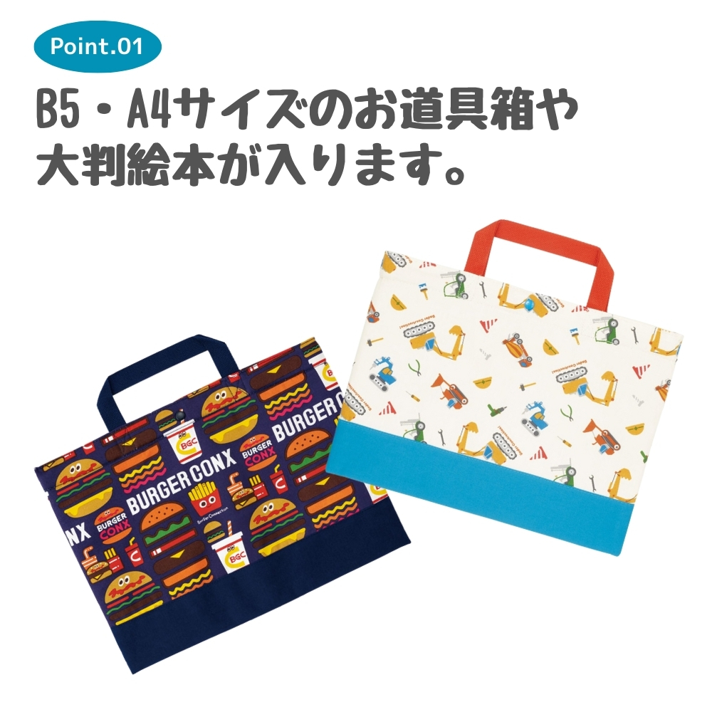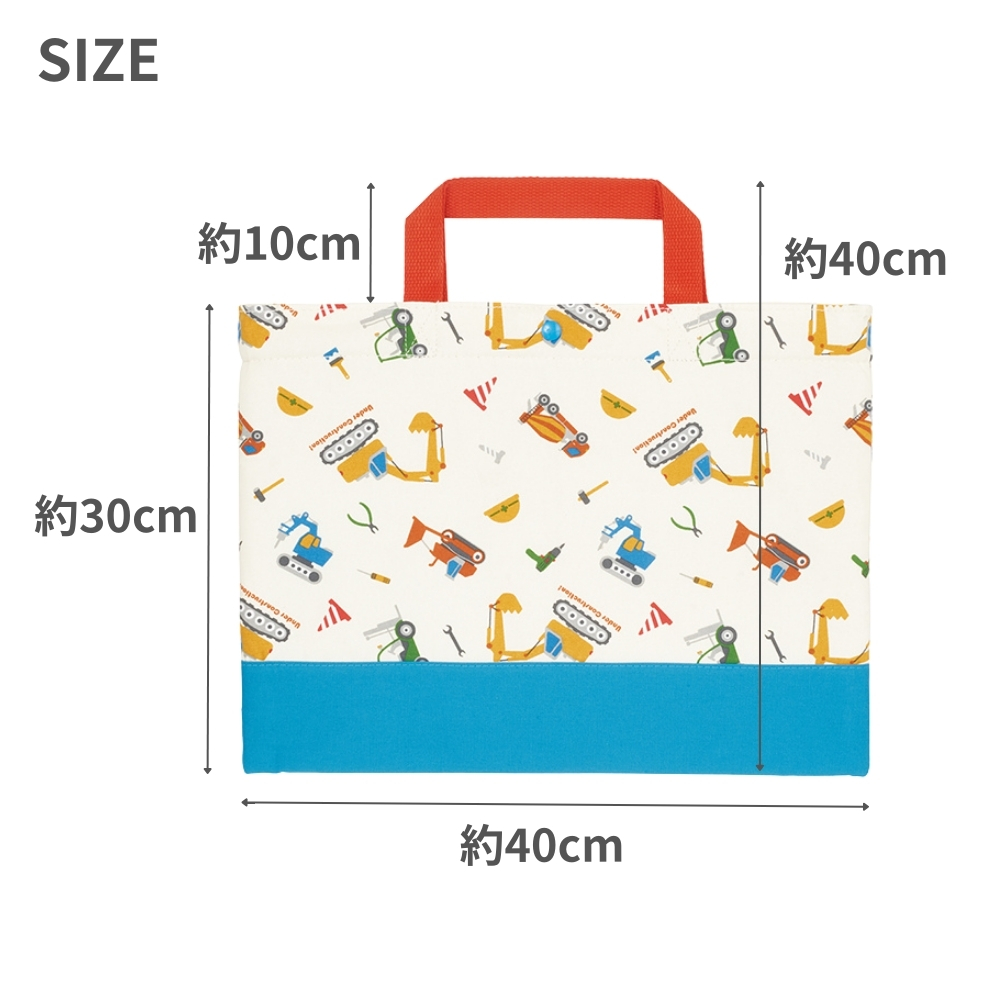 -仕様- ・本体サイズ: 横400mm×縦300mm ・持ち手の長さ: 100mm ・持ち手から底までの長さ: 400mm ・重さ: 135g ・材質: 表地、裏地、持ち手: 綿100%、中材: ウレタン、不織布 ・カラー:バーガCONミックス、はたらくクルマ、ディノサウルス、ラブユニコーン、TRAIN ・製造国: 中国