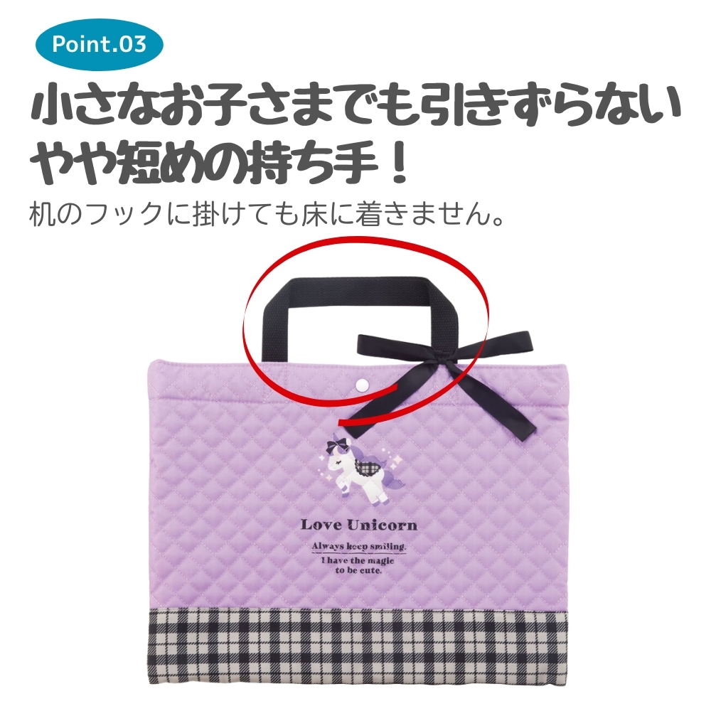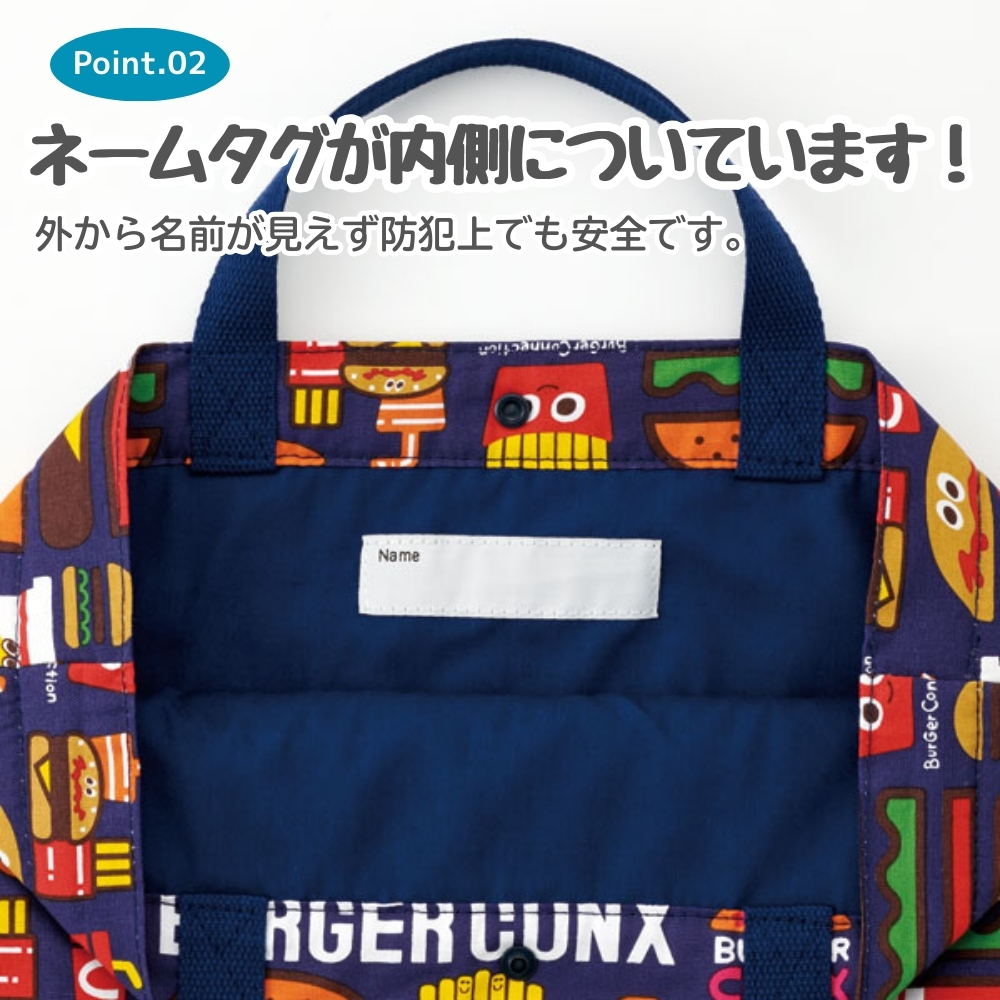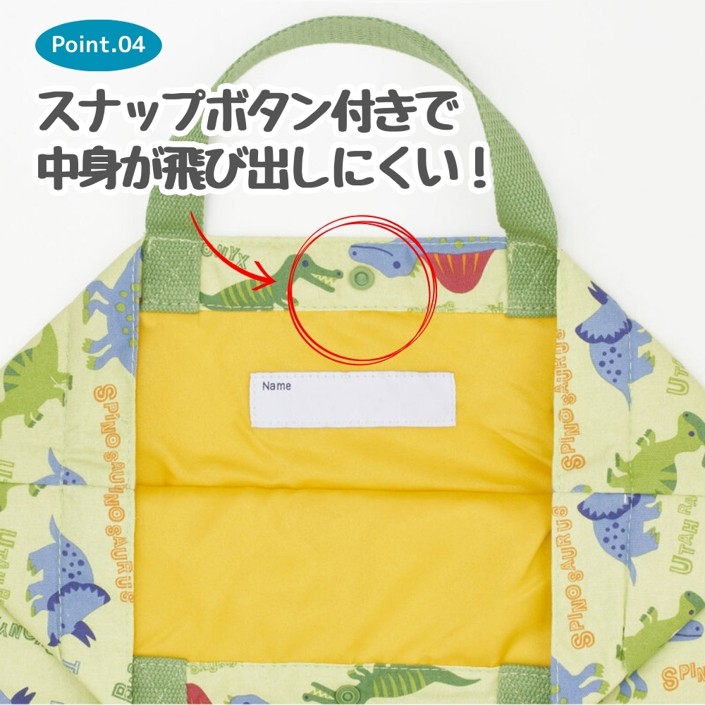 -機能- ・スナップボタン付きで、中身が飛び出しにくく安全 ・ネームタグは内側に配置され、外から名前が見えず防犯上も安心 ・短めの持ち手で、小さなお子様でも持ちやすく、机のフックに掛けた際にも床に付きにくい設計