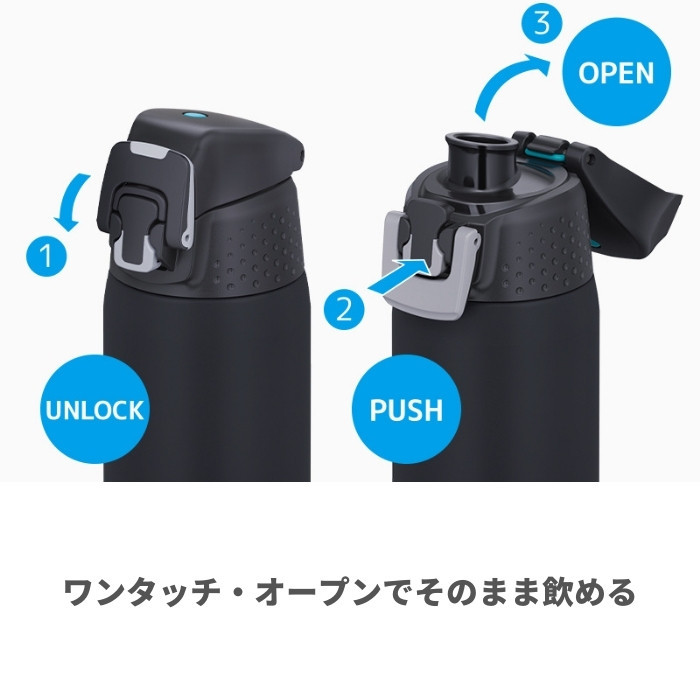 冷たさをキープする真空断熱構造の保冷専用ボトル。片手で操作しやすいロックリング付き。