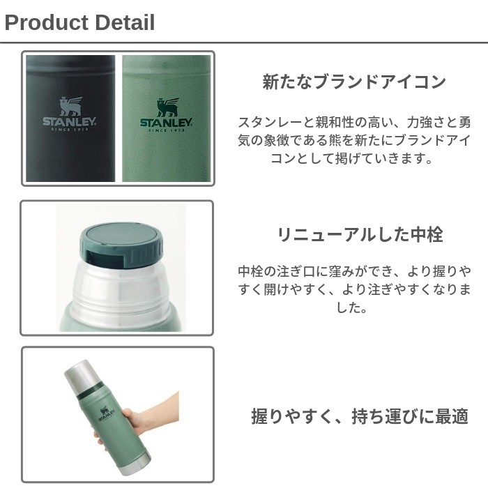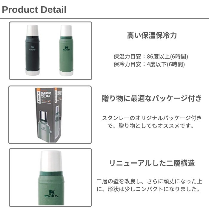 | ・スタンレーを代表する真空断熱ステンレスボトル ・創業100年を越えるスタンレーの定番モデル「クラシックシリーズ」の真空断熱ボトル。 ・新たなブランドアイコンと共に、より使いやすくパワーアップしました。 ・仕様変更前は対応していなかった食洗機での洗浄が可能になりました。 ・ステンレス素材に渋みのあるハンマートーン加工を施したボトルは、高い保温保冷機能をもちろん、耐久性も兼ね備えた唯一無二の存在。 ・キャンプやイベントなど様々なシーンで使用できます。 ・二層の壁を改良し、さらに頑丈になりました。 ・スタンレーのオリジナルパッケージ付きで、贈り物としてもオススメです。 |