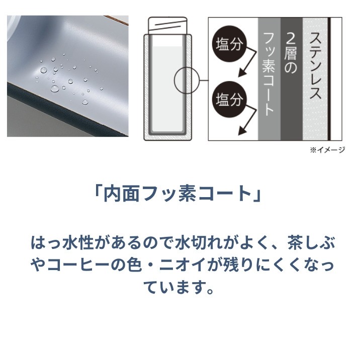 | はっ水性があるので水切れがよく、茶しぶやコーヒーの色・ニオイが残りにくくなっています。 |