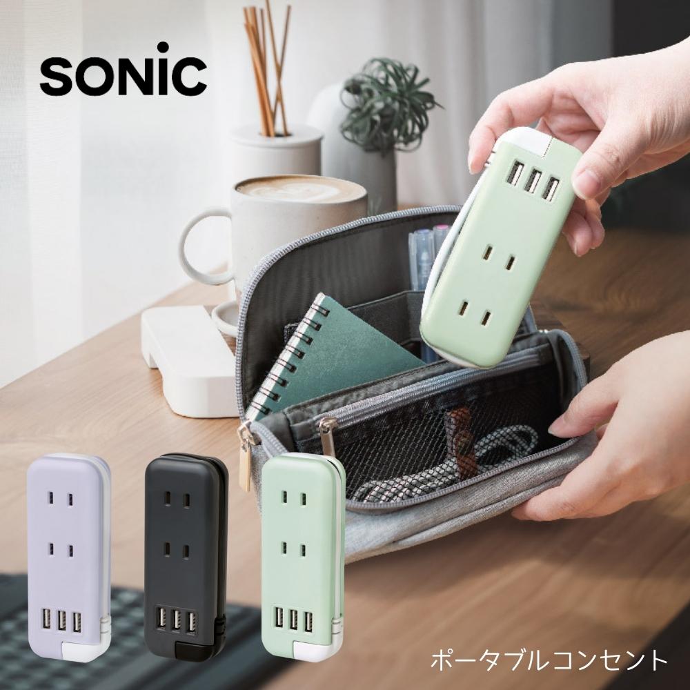 ソニック スリム ポータブルコンセント ポーチ付 メール便対応 USB-A UL-6345 usb コンセント 薄型 ACコンセント 3口 3ポート タコ足 卓上