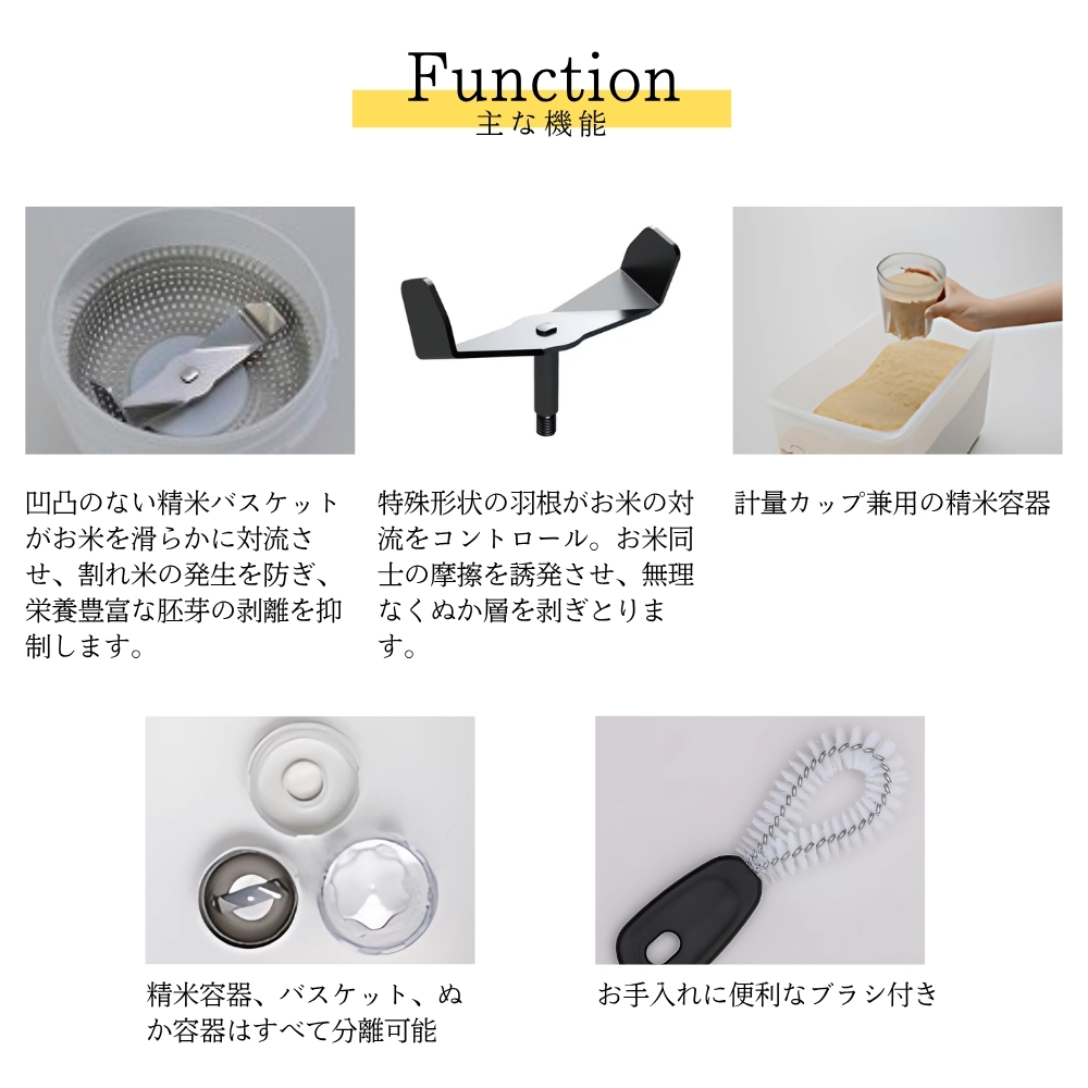 ・計量カップ兼用精米容器&分離可能なパーツでお手入れも簡単。