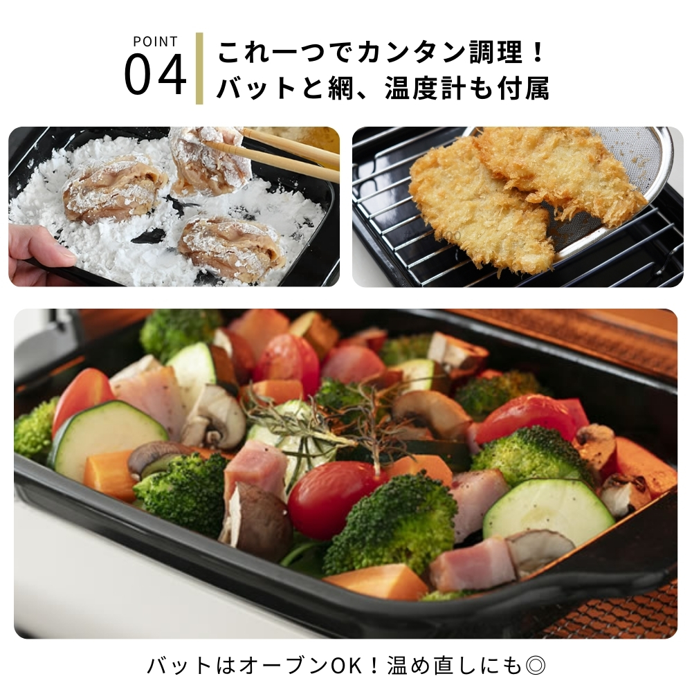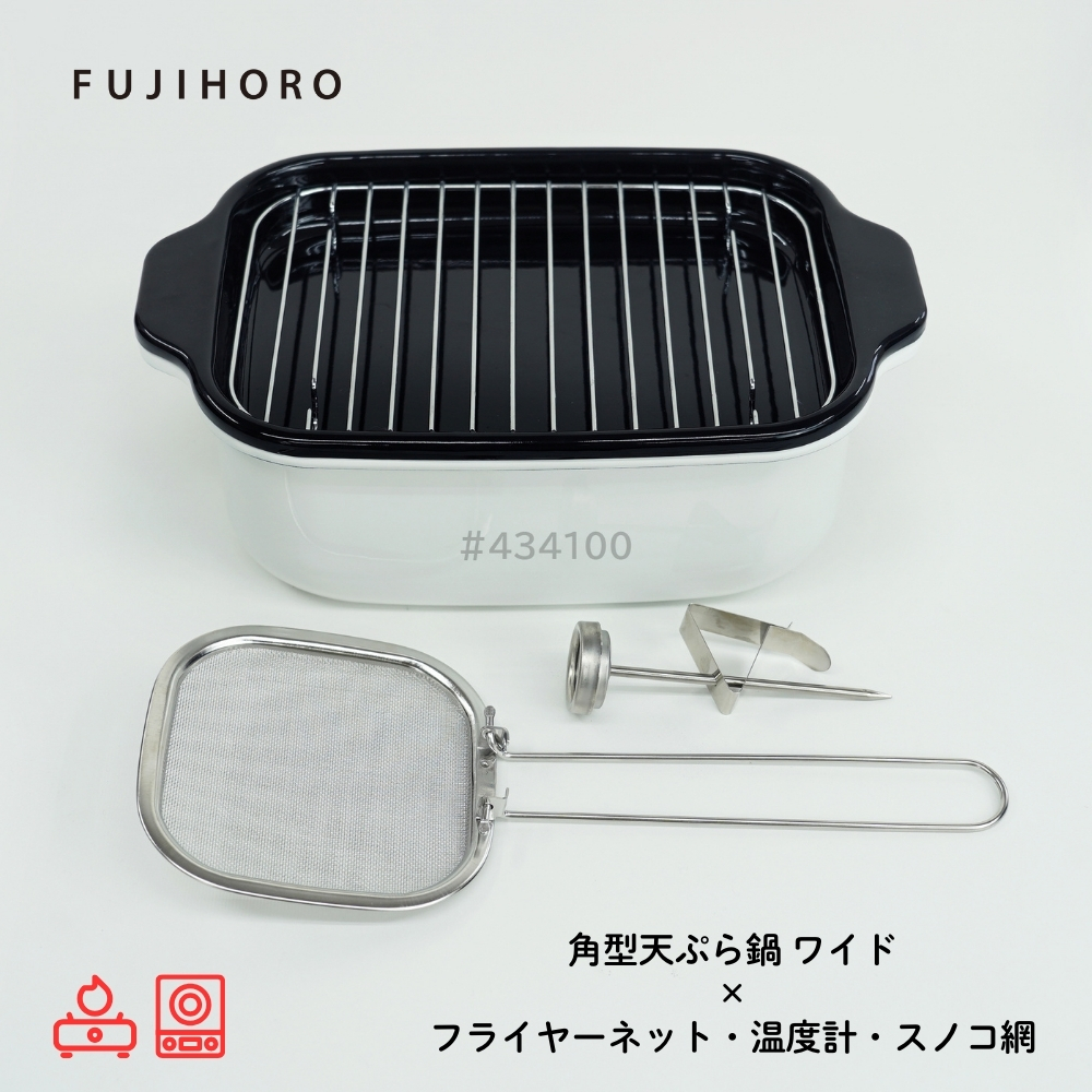| 商品名: 富士ホーロー 角型 天ぷら鍋 ワイド フライヤーネット 温度計付き スノコ網 TP-22KN.W IH対応 ガス火 ホーロー 四角 少ない油 揚げざる -商品説明- 角型天ぷら鍋 ワイド×フライヤーネット・温度計・スノコ網 人気の角型天ぷら鍋ワイドにフライヤー付きが登場! 大人気の角型天ぷら鍋ワイドにフライヤー付きが登場しました。 フライヤーは折り畳んで収納できる優れもの。 便利なバットとすのこ網もセットに☆ 防水型の温度計も付いていて全て重ねてコンパクトに収納出来ます。 取っ手が折り畳めるので、コンパクトに収納可能です。 ※布巾など挟んで収納してください。 スリムな角型で約2.8cmの高さまで油が入ります。 横幅があるので、アスパラやエビフライも簡単に揚げられます。 付け合わせやお弁当のちょっと上げにも◎ お手入れ簡単なホーロー素材で、揚げ具合もよくわかる白色です。 バットはオーブンOK!温め直しにも◎ コンパクトに収納でき、使わない時もすっきり! -特徴・品質- ・耐久性と熱伝導性に優れたホーロー用鋼板を使用。 ・白色の内面で揚げ具合が見やすく、調理がスムーズ。 ・防水型の温度計は丸洗い可能で使いやすさ抜群。 ・ホーロー特有の滑らかな表面で汚れが付きにくくお手入れ簡単。 -仕様- ・鍋本体サイズ:約 W27.5×D17.3×H8.8cm ・バットサイズ:約 W27.5×D17.3×H2.8cm ・すのこ網サイズ:約 W20.8×D14.6×H1.6cm ・フライヤーサイズ:約 W11.5×D11.5×H16.5cm ・適正油量:約800g(本体刻印目印あり) ・満水容量:約2.6リットル ・重量:約1400g ・素材:ほうろう用鋼板(底の厚さ1.0mm) ・原産国:タイ ・IH200V対応/ガス火対応 ・オーブン使用可(バットのみ) -機能- ・少量の油でも効率よく調理可能な設計。 ・折り畳み可能な取っ手でコンパクト収納が可能。 ・フライヤーネットやスノコ網が揚げ物の油切りをサポート。 ・防水型温度計で温度管理が簡単。 -使用・手入れについて- ※琺瑯は製造上、製品の端部に釉薬が定着しにくく、端部分が黒く見えることがあります。これは一層目の琺瑯面で、不良や不具合ではありません。 ※琺瑯を焼成炉で焼く際に、機種によってはふちの裏に針をかけて吊るすため、ふちの裏に「吊り跡」がある場合がございます。製造工程上その針跡がつきますが不良ではありません。 ※琺瑯を焼成炉で焼きあげる際にすすなどが付着して、内面・外面にある黒い点があることがありますが、衛生上・ご使用上問題ございません。 ※ガスコンロにてご使用の場合、五徳の中央に置いて安定することを予め確認してください。 ※五徳との相性により不安定な場合は、もち網等を置き、安定性を確保してからご使用ください。 ※油の温度を200℃以上に上昇させないでください。 ※油を適正油量以上入れないでください。また、500ml未満の油量で調理しないでください。 ※付属のバットや他の蓋などを本体にのせないでください。 ※加熱調理中、調理の直後は、本体や取っ手部分が高熱となりますので、必ずミトン等を使用して下さい。 ※電子レンジでは使用できません。 ※ストーブの上では使用しないでください。 ※炒め物に使用しないでください。 ※縁まで水などを満たした状態で使用しないでください。 ※IH調理器のご使用際は必ず中レベル以下からご使用ください。 ※その他お手入れ方法や注意事項などいずれも商品と同梱しております「取扱説明書」を必ずお読みの上、お読みになった後は必ず保管して下さい。 -注意事項- ・商品の色はできる限り実物に近づけていますが、ディスプレイ設定や撮影条件により色味が異なる場合があります。ご了承ください。 ・ご注文のタイミングや内容により、購入後のキャンセルや修正が制限される場合があります。 ・同時に複数のご注文があった場合、システム上の遅延により在庫がないにも関わらず購入できてしまう場合があります。そのような場合は速やかにメールでお知らせいたします。 |