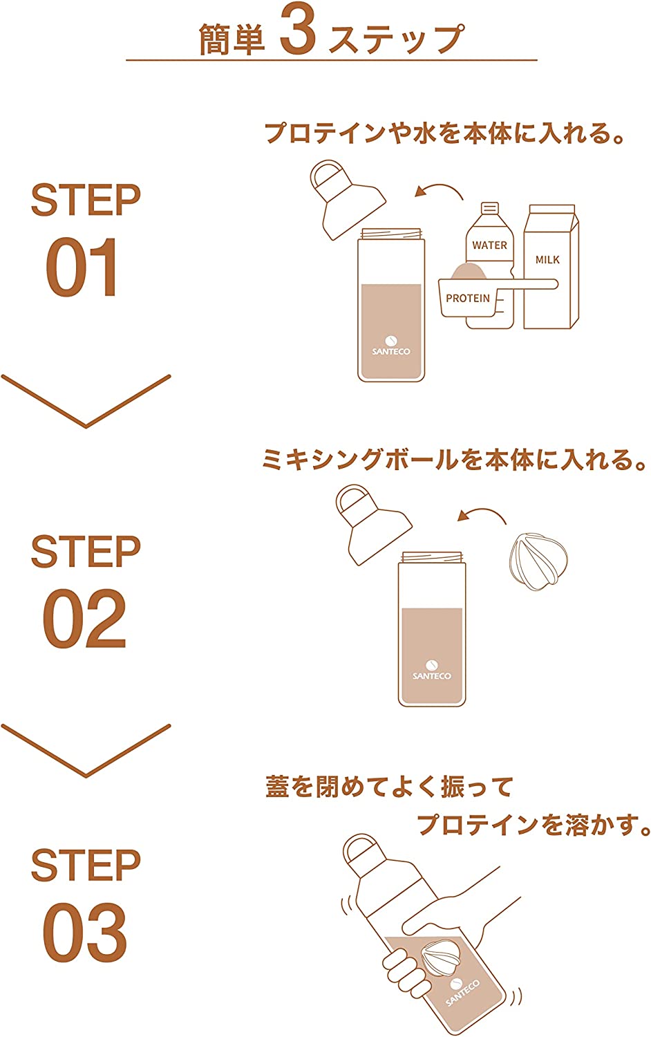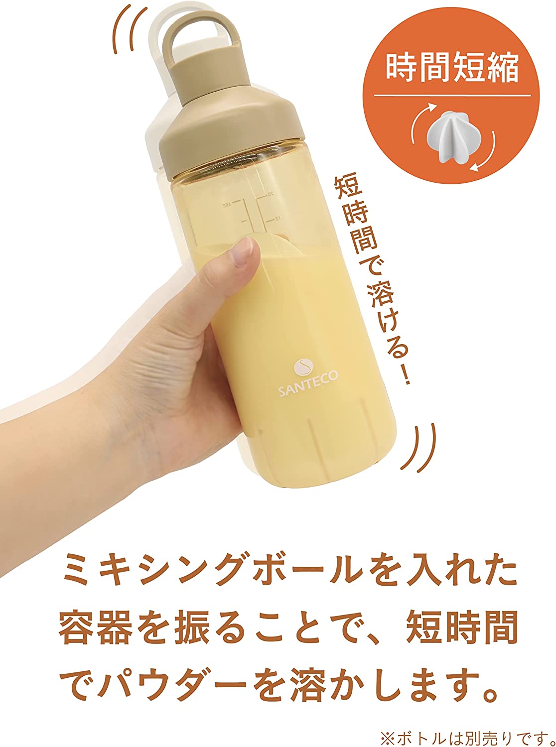 ミキシングボールを入れることでプロテインが均等に溶けて、しっかり撹拌されダマになりにくい。素早く溶けるのでストレスも減少。