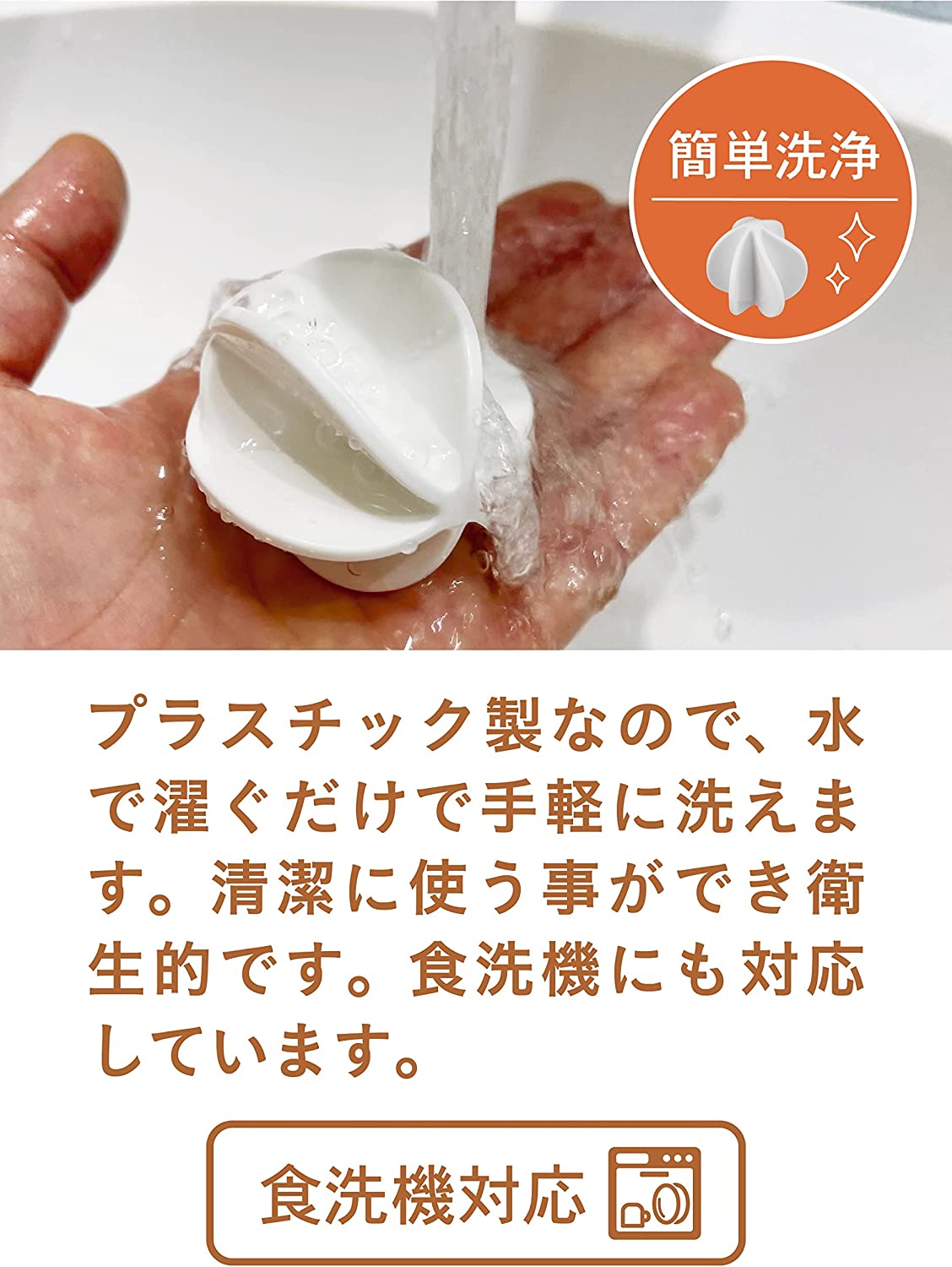 プラスチック製なので、水で濯ぐだけで手軽に洗えます。清潔に使う事ができ衛生的です。食洗機対応。