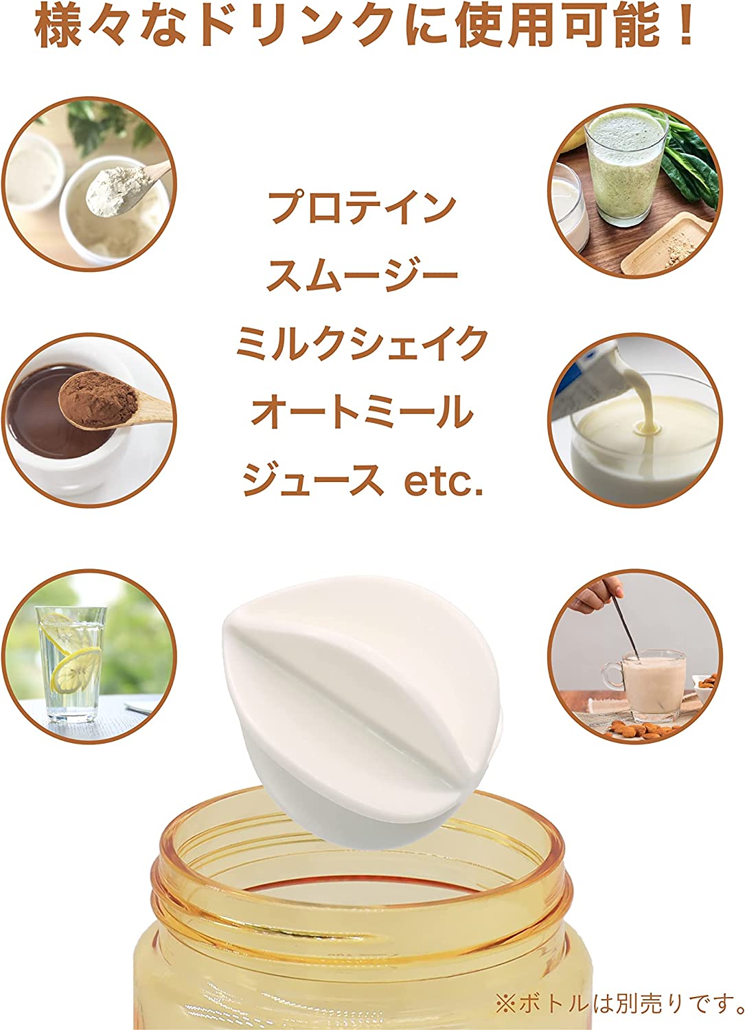 プロテインだけでなく、スムージー、ミルクシェイク、オートミール、シュースなどにも使えて便利。