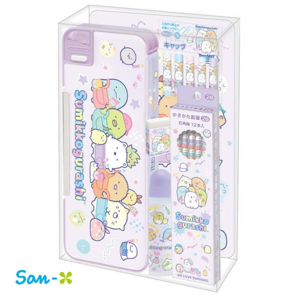 とってもかわいいすみっコぐらしデザインの自由帳・下敷・のり・キャップ・2Bかきかた鉛筆・消しゴム・筆箱の合計7点がセットになっています!