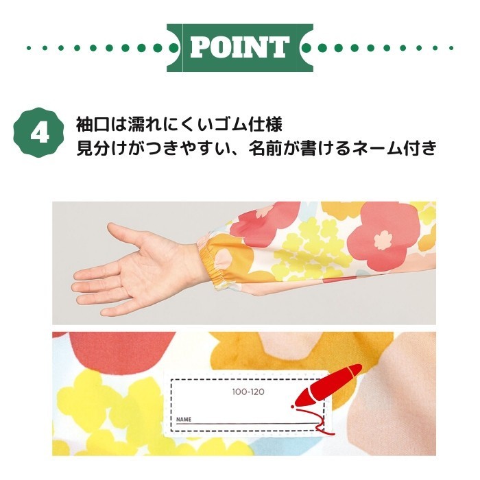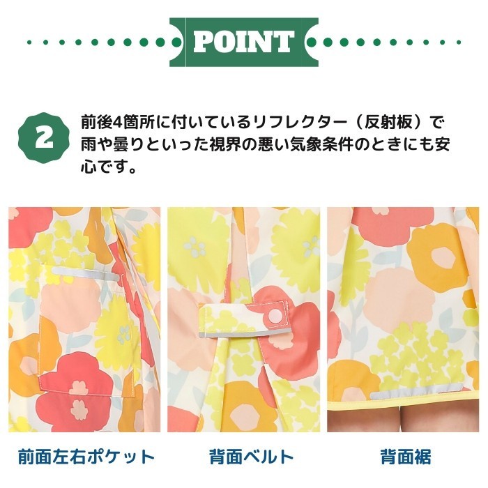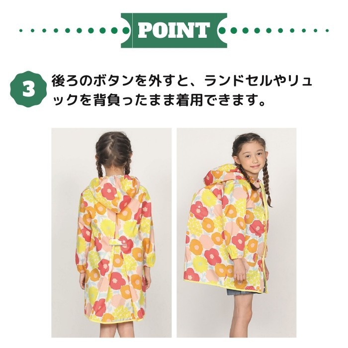 | ・元気なデザインで可愛い子ども用のレインポンチョ。 ・安全に使えるようこだわりました。着脱は簡単・安全なスナップボタンタイプ。 ・袖口は濡れにくいゴム仕様になっています。 ・カバンやリュックを背負った上からでも着ることができるのが嬉しいところです。 ・首元にはお名前をかくネームがついており、同柄の収納袋も付いているので使い終わった後はこちらに収納。 ・通学・通園にも使いやすい仕様になっています。 |