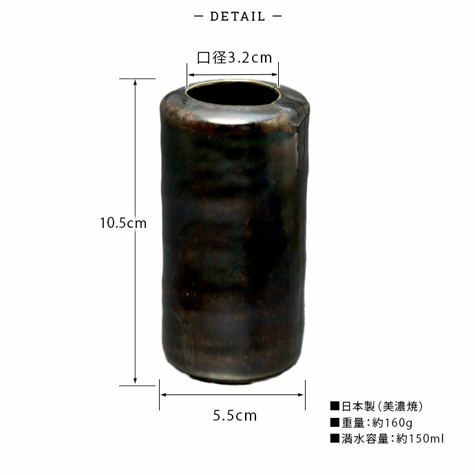 サイズ:約口径3.2×幅5.5×高10.5cm ▼満水容量:150ml ▼重量:約160g ▼原産国:日本製(美濃焼) ▼材質:磁器 ▼電子レンジ:不可 ▼食洗機:不可 ▼※手作業による色付けの為、多少趣が異なる場合がございます。