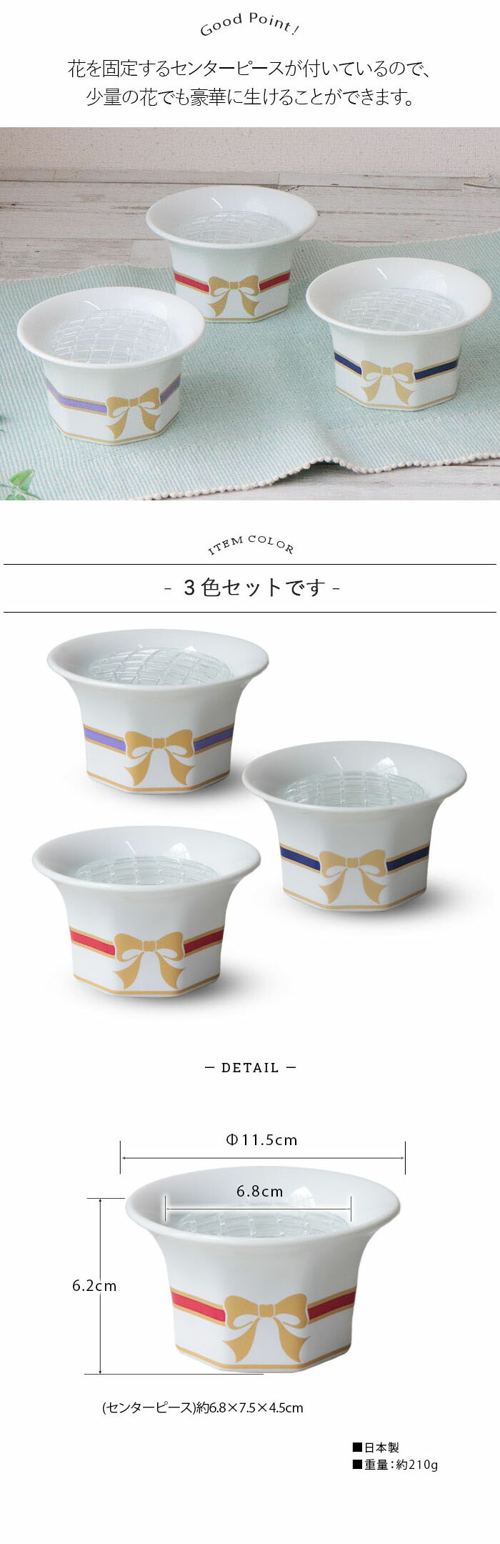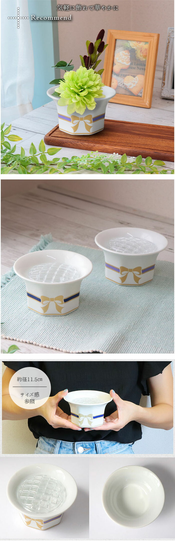 サイズ:約径11.5×高6.2cm、センターピース:約6.8×7.5×4.5cm ▼満水容量:- ▼重量:約210g ▼原産国:日本製 ▼材質:長石・硅石・粘土、センターピース:ポリプロピレン ▼電子レンジ:不可 ▼食洗機:不可