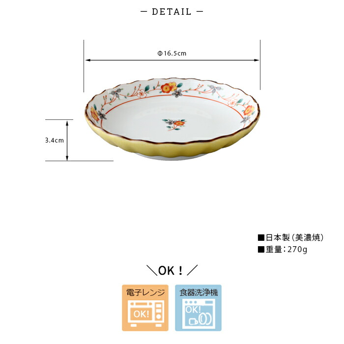 サイズ:約Φ16.4×高3.6cm▼満水容量:ml ▼重量:約270g ▼原産国:日本製(美濃焼) ▼材質:磁器 ▼電子レンジ:可 オーブン:不可