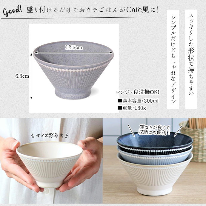 ▼サイズ:約径12.5×高6.8cm ▼満水容量:約300ml ▼重量:約180g ▼原産国:日本製(美濃焼) ▼材質:磁器 ▼電子レンジ:可