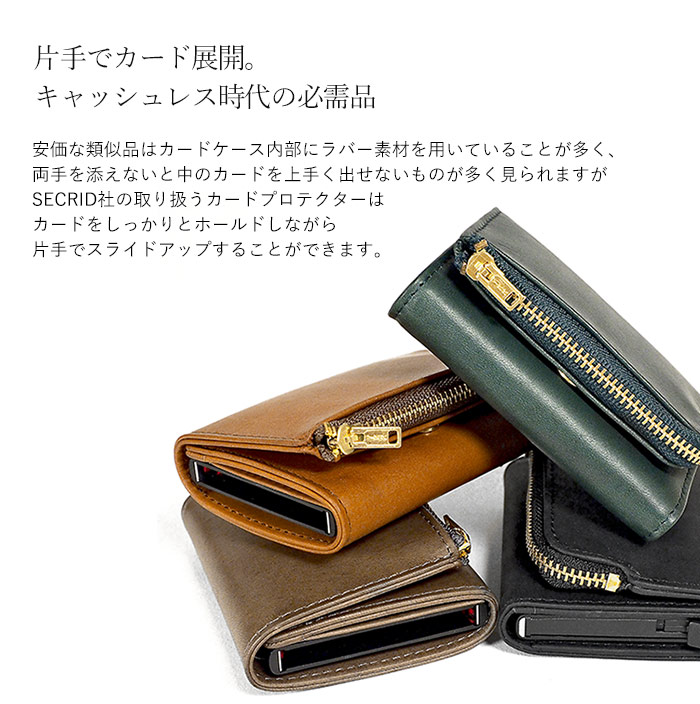 | ご注意 | ・紙製のカードを収納した場合、綺麗な段差で飛び出ない場合があります。 ・素材の特性上、摩擦や水濡れ等の影響で衣類に色移りする場合があります。 ・カードケースに過度な圧迫、衝撃が加わるご使用は故障の原因となるためご注意ください。 |