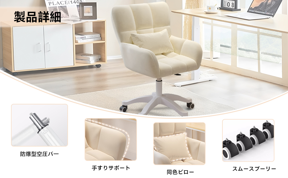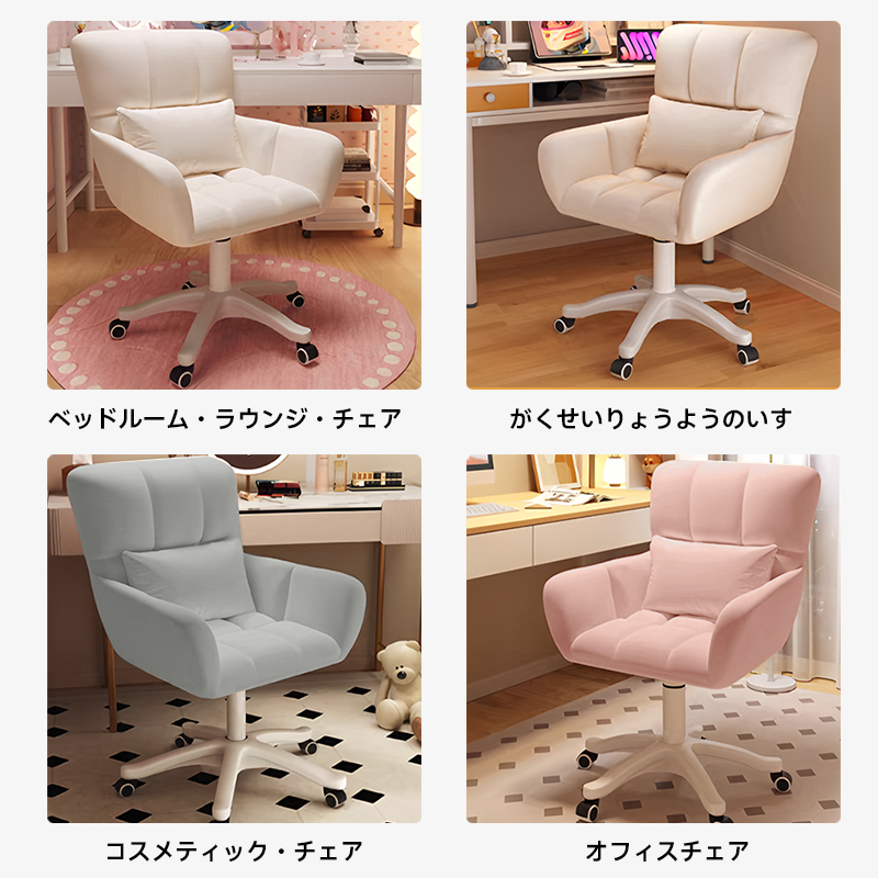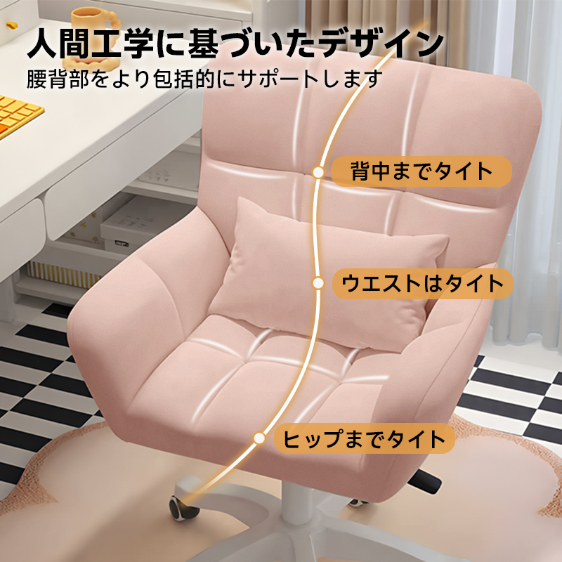 椅子 かわいい 腰クッション付き ふわふわ ベロア キャスター付き オフィスチェア パソコンチェア 360°回転 高さ調節自由 勉強 在宅ワーク 組立簡単