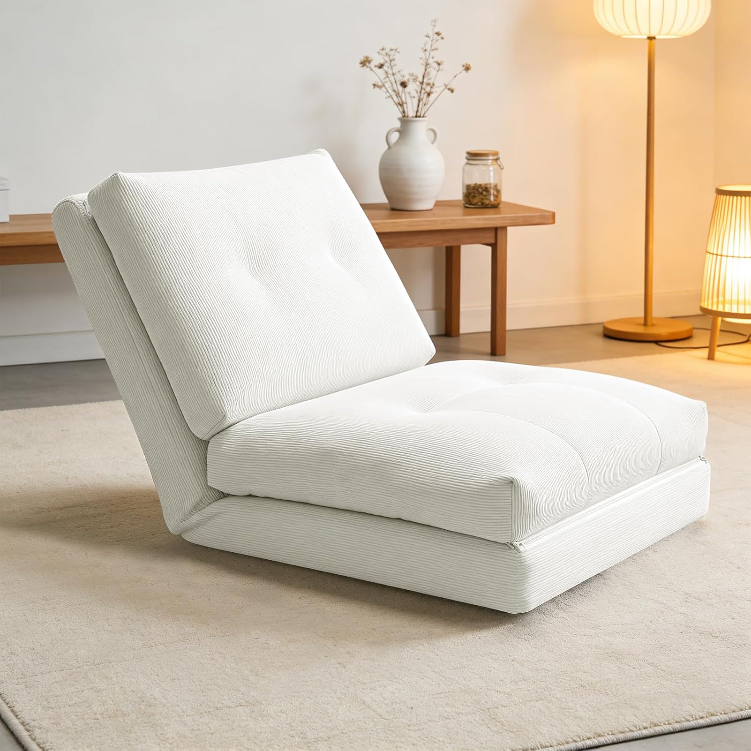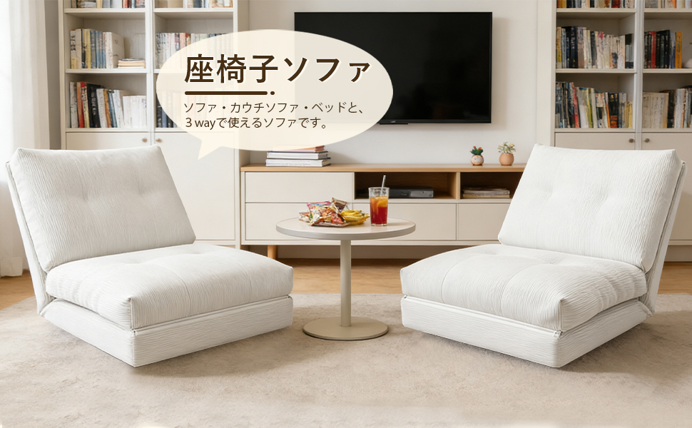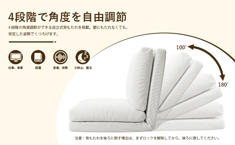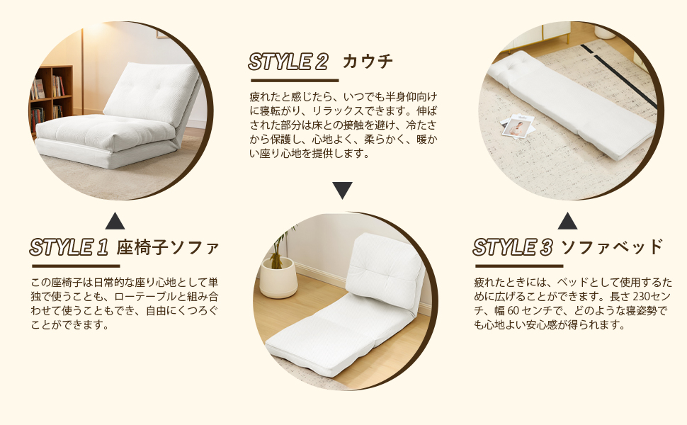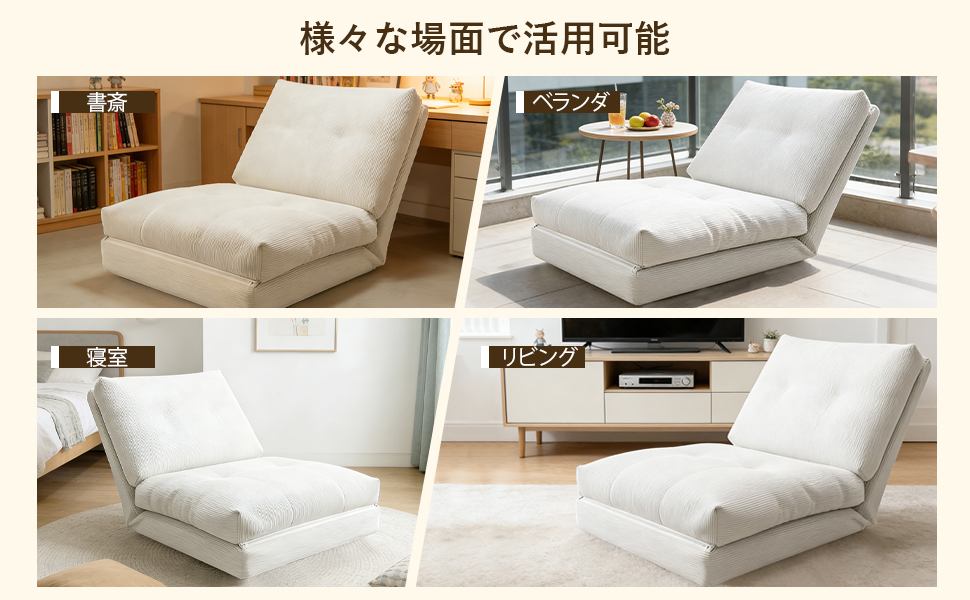 【組立簡単・3WAYマルチ機能】2本のファスナーをつなぐだけで簡単に組み立て完了、難しい作業は一切不要、説明書が付属しており、約 5 分で組み立てが完了します。3段階の角度調整が自由にでき、ソファとベッドをスムーズに切り替えられます。90°の直立モードは仕事や勉強に、120°のリクライニングモードは読書やテレビ視聴などリラックスタイムに最適。フラットに展開すれば快適なベッドに早変わり。仕事・くつろぎ・休憩をこれ一台でこなせる、シンプルで実用的なデザインです。