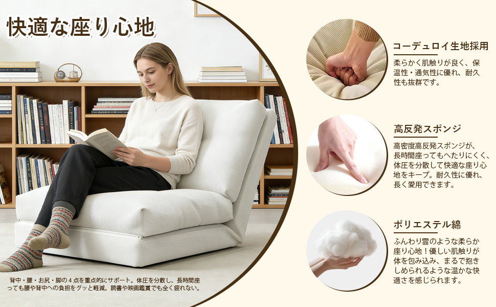 【快適な座り心地】柔らかなコーデュロイ生地は、凹凸のストライプ柄が通気性に優れ、夏はサラッと涼しく、冬は暖かく、四季を通して快適にお使いいただけます。内部にPP綿と高密度ウレタンを使用し、しっかりと体を支え、長時間座ってもへたりにくい設計です。ハイバックデザインで、肩・背中・腰までしっかりフィットし、快適にサポートします。