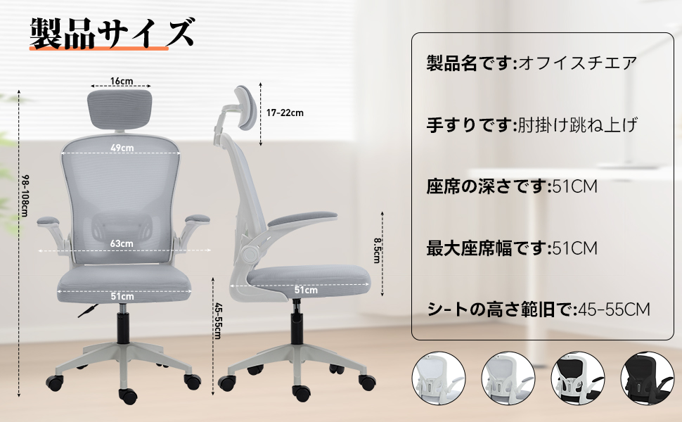 【製品仕様】オフィスチェアのサイズ:幅 51× 奥行 51× 高さ 98〜108cm(座面高さ:45〜55cm)。ヘッドレストの幅は 16cm です。手作業による測定のため、若干の誤差が生じる場合がありますので、ご了承ください。説明書を同梱しておりますので、迅速かつ容易に組み立てを完了することができます。