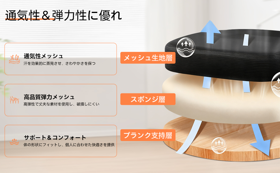 【通気性メッシュ生地と厚みのある座布団】背もたれと座面はいずれも通気性メッシュ布を採用しています。メッシュ製の背もたれは通気性が良くて清涼感があり、背中とお尻を快適な状態に保ちます。厚みを増やして幅を広げたスポンジ座面は、耐荷重面積を拡大させるだけでなく、お尻の曲線によりフィットし、お尻への負担を軽減します。