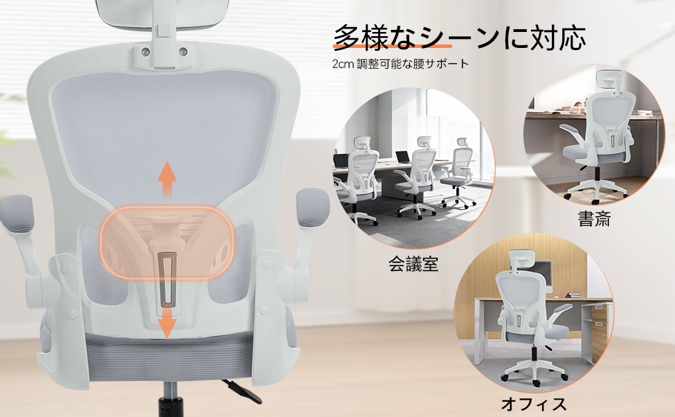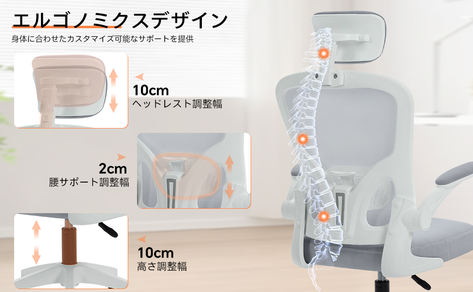 【人間工学設計】背もたれは上下2cmの範囲で調整でき、最も快適な高さを選択することができます。本製品の椅子は人間工学に基づいて設計・製造されています。S 字形状の背もたれは伸縮性のあるメッシュ素材で製作されており、お尻と背中の曲線に完美にフィットし、快適なサポートを提供します。長時間座っていても疲労感を感じにくいです。