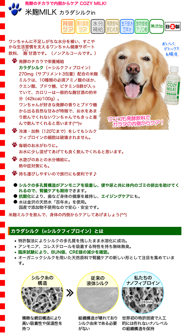 ワンちゃんに不足しがちな水分を補い、すこやかな生活習慣を支えるワンちゃん健康サポート飲料、 麹 ( こうじ ) 甘酒です。(ノンアルコール)