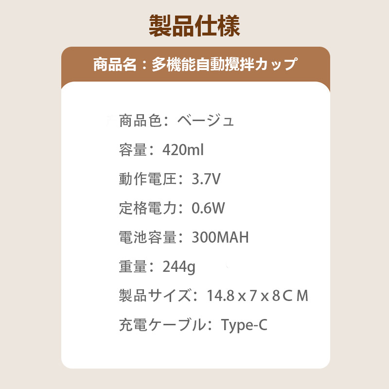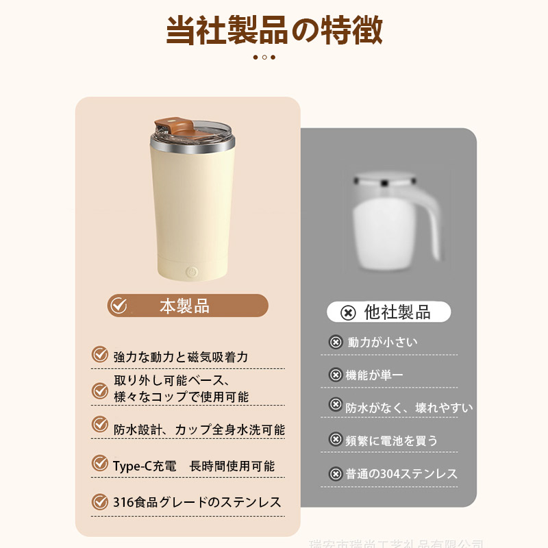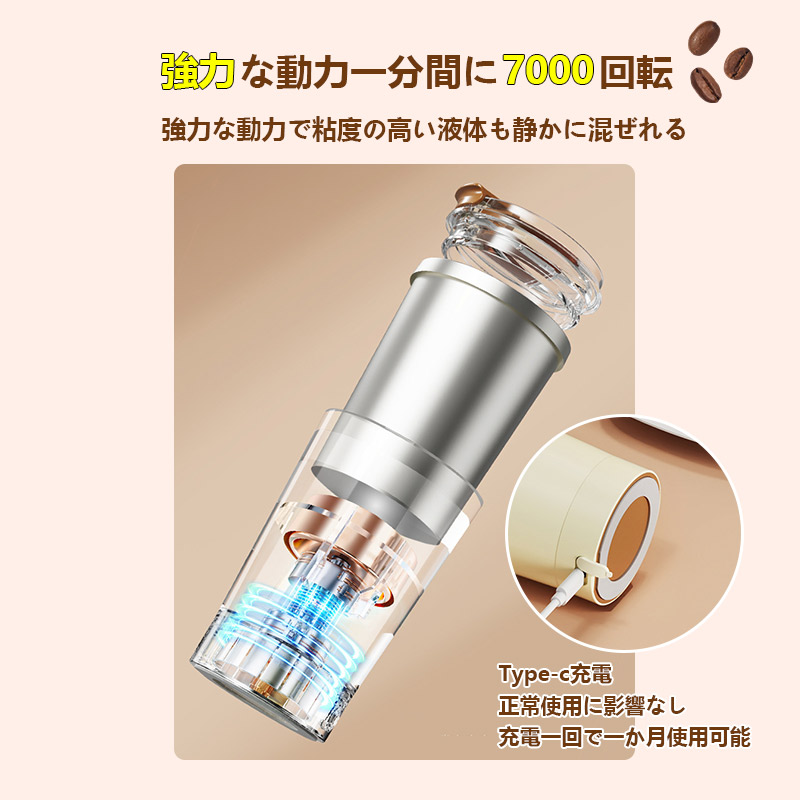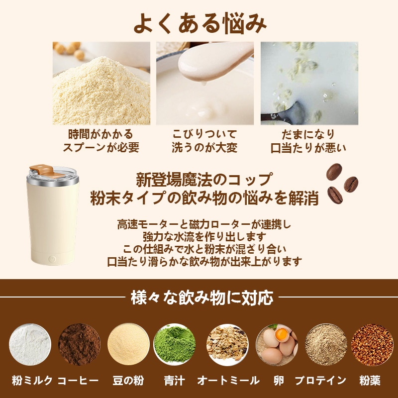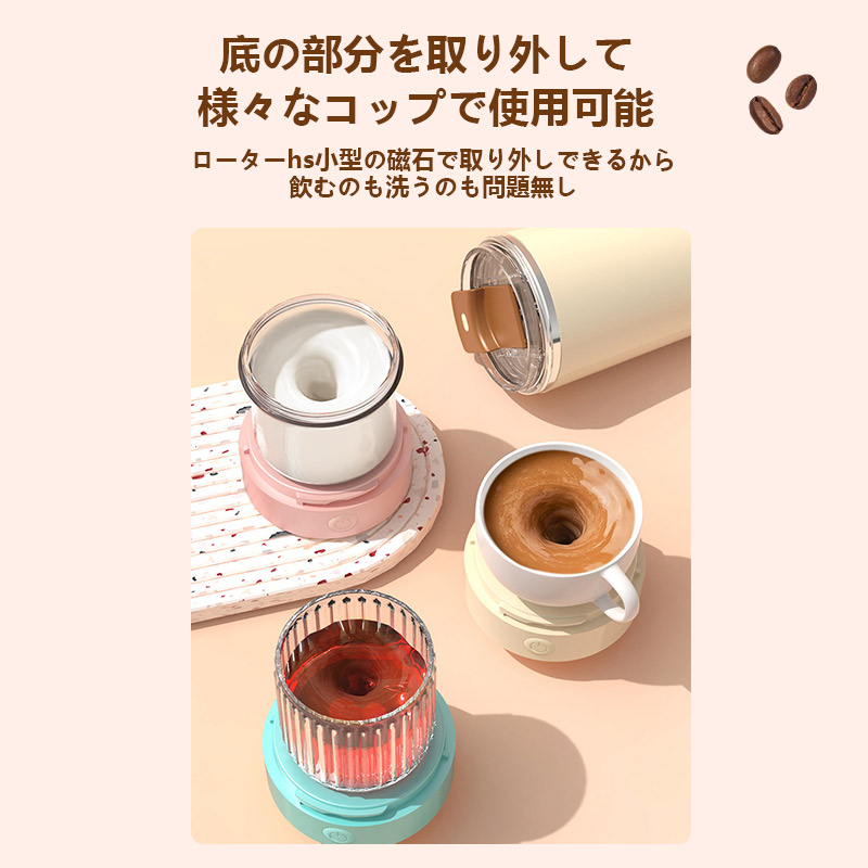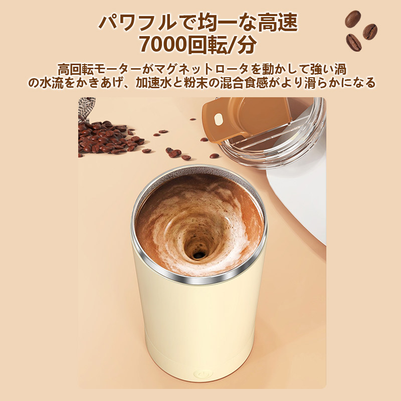 【自動かき混ぜ】粉末状の飲料が完全に溶けない問題を一発で解決。磁力回転で、カップ内の液体を毎分7000回転の強力でかき混ぜ、粉末を完全に溶かします。