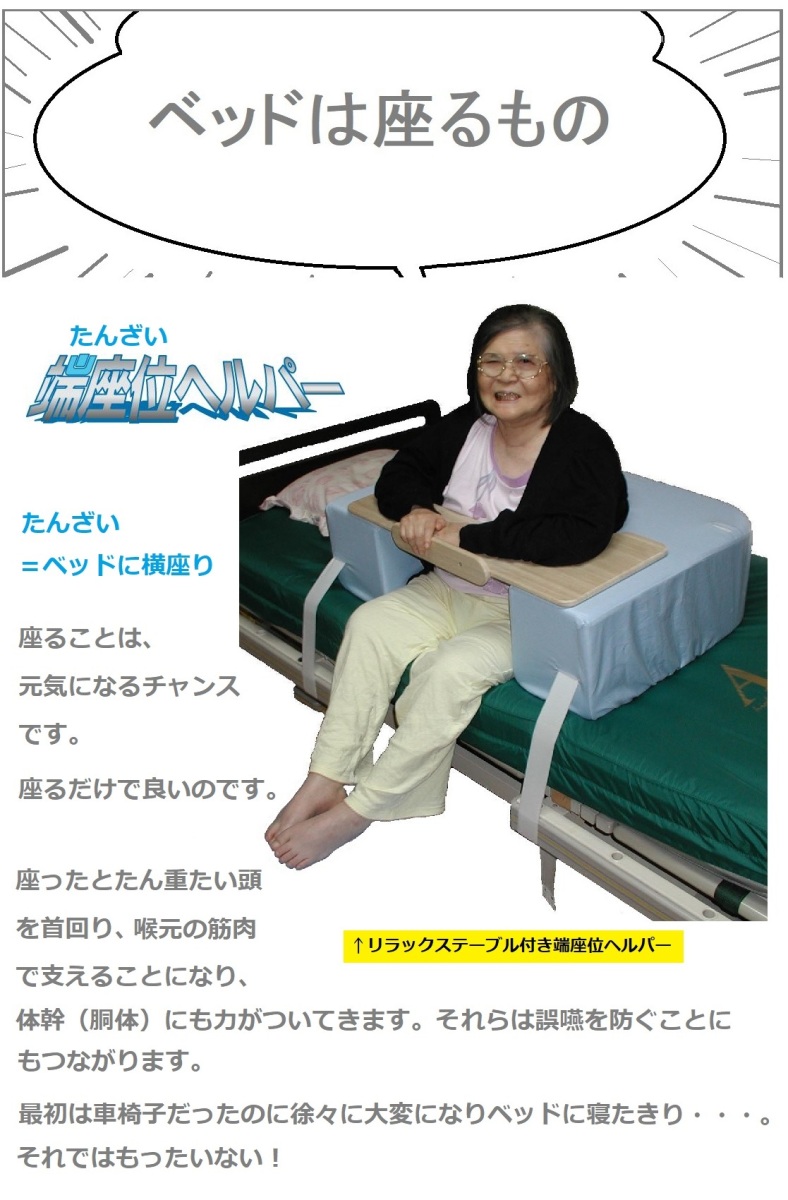 座ったとたん重たい頭を首回り、喉元の筋肉で支えることになり、体幹(胴体)にも力がついてくると誤嚥防止にもつながります。
