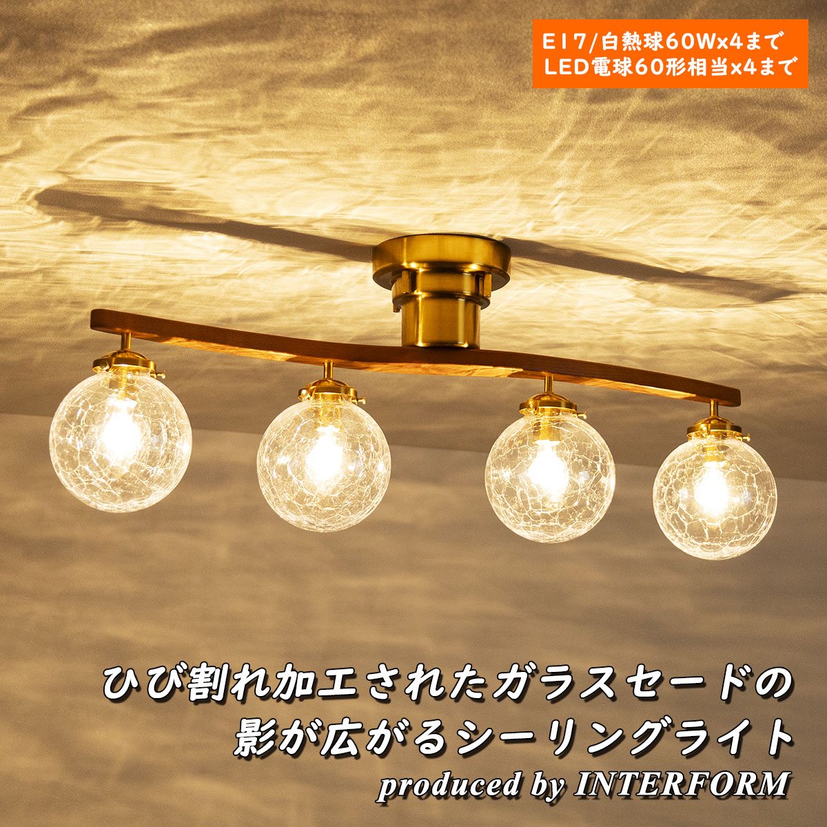 シーリングライト 天井照明 4灯 INTERFORM Owen Crack インターフォルム オーウェン クラック 木製アーム ガラス LT-4023CR LT-4024CR LT-4025CR