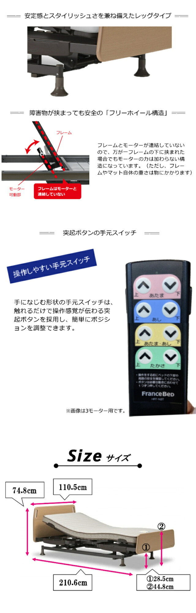 ■フランスベッド 電動ベッドフレーム■安全性を高めた低床設計「レステックス」快適な生活をサポートする電動リクライニングベッドです。●3モーター機能を備えた電動ベッドフレームです。