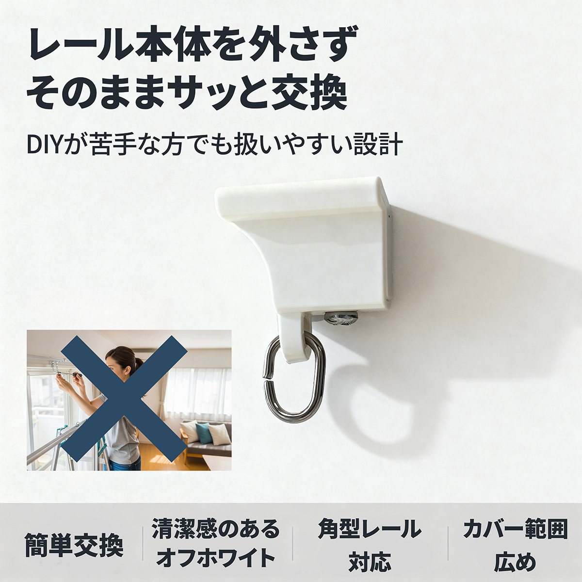 レール本体を外さず、そのままサッと差し替えられるので、DIYが苦手な方や工具を持っていない方でも扱いやすいアイテムです。