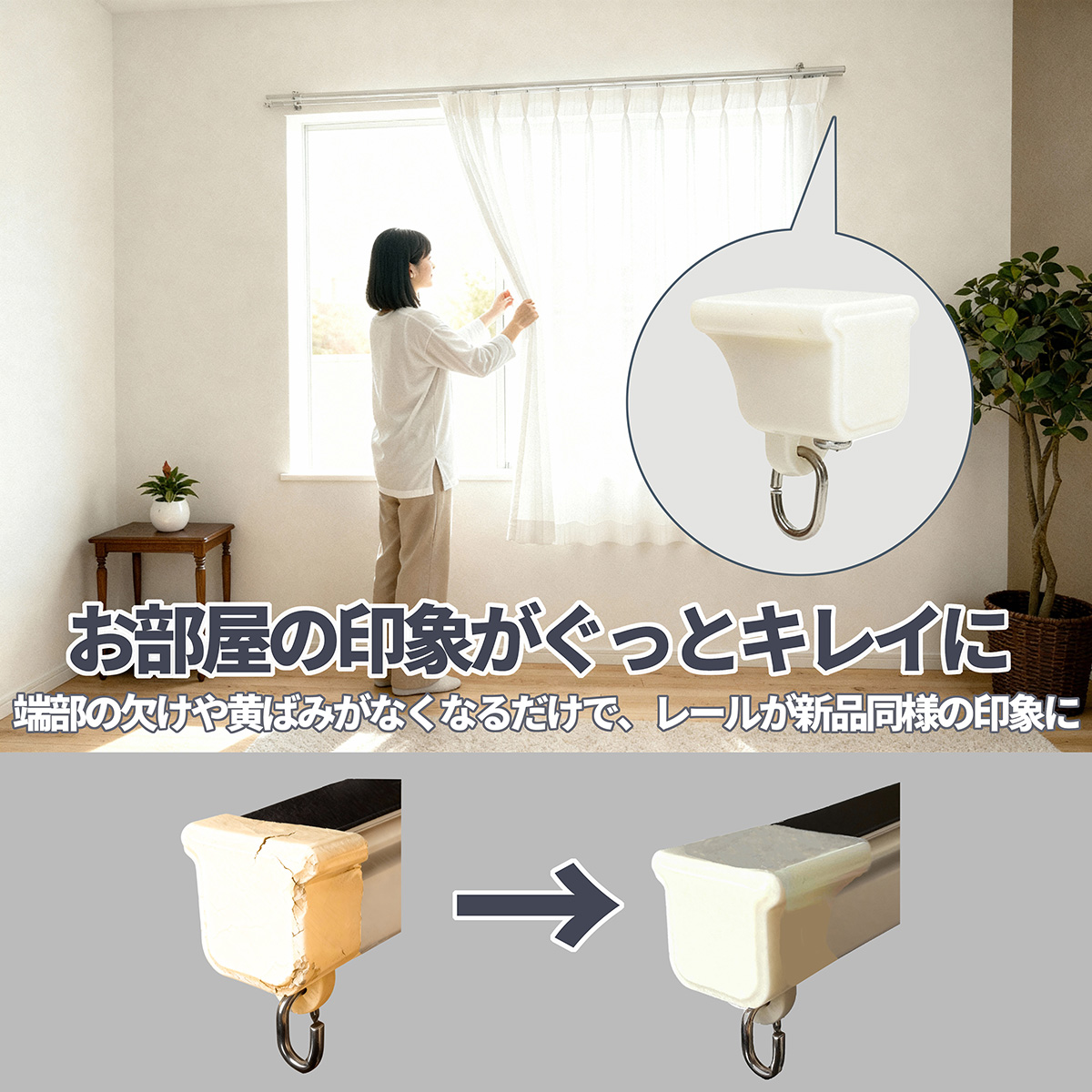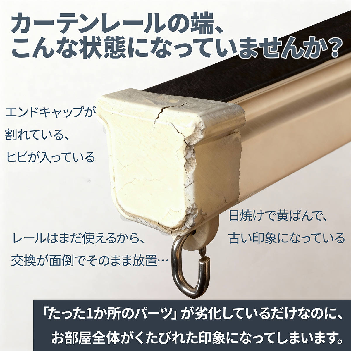 カーテンレールの端のエンドキャップが割れ・ヒビ・黄ばみで古びた印象になっていたり、レール自体は使えるのに「交換が面倒」でそのまま放置していませんか?