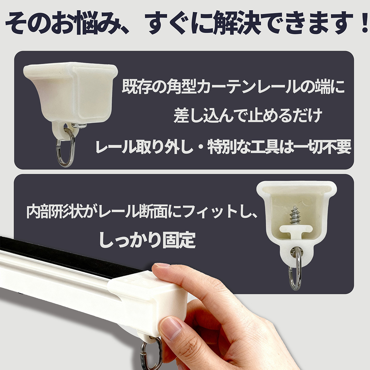内部形状がレール断面にフィットし、端部をフタのようにしっかりカバーする構造で、カーテンが落ちにくくなるのもポイント。