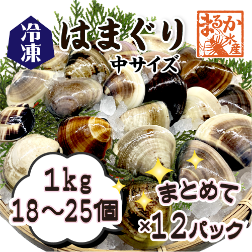 1kg辺り 18〜25個入りの中サイズ(40〜60g)のはまぐりを12kg(12パック)送料無料でお届けします。