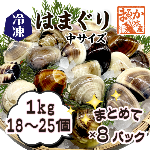 1kg辺り 18〜25個入りの中サイズ(40〜60g)のはまぐりを8kg(8パック)送料無料でお届けします。