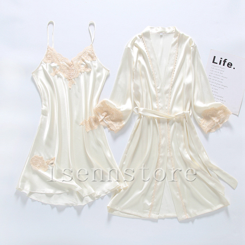 ガウン&キャミワンピース 2点セット ルームウェア サテン レース レディース ひんやり パジャマ シルク風 長袖 ネグリジェ キャミソール インナー 部屋着