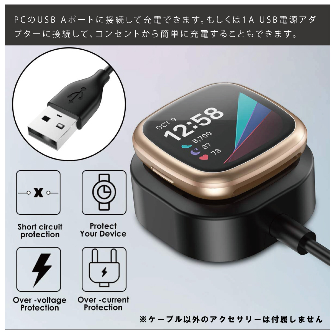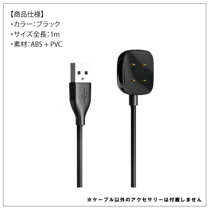 fitbit versa 4 / fitbit versa 3 / fitbit sense 2 / fitbit sense本体で使える1mの充電ケーブルです。スマートウォッチは、時計以外にも様々な機能を兼ね備えており、非常に便利なアイテムですが、1つ難点なのがスマホと同様に「充電式」であるということです。せっかくの高性能でも充電が切れてしまえば一切使用することが出来ないため、常に心配しておく必要があります。そんな時に役立つアイテムが充電ケーブルです。全長1mのベーシックタイプで収納時はコンパクトにまとめられます。小さなカバンであっても持ち運びやすい仕様となっております。