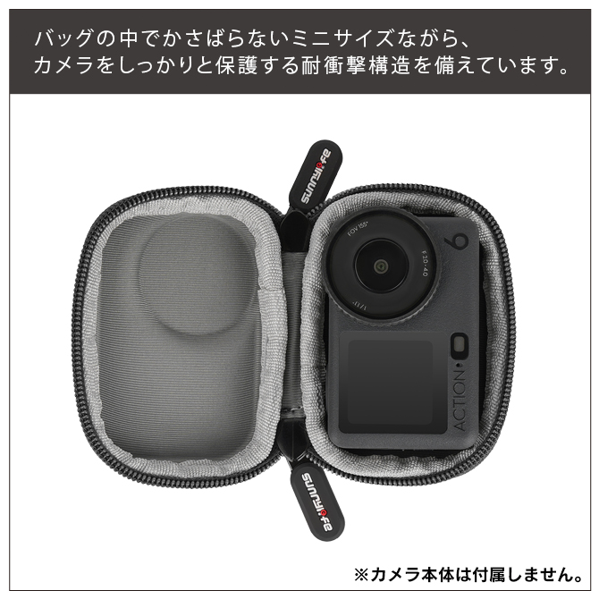 DJI Osmo Action 6 / 5 Pro / 4 / 3カメラ本体に対応したミニ収納バッグです。Vloggerに必須の自撮り棒や三脚を装着したまま収納できる専用設計です。バッグの中でかさばらないミニサイズながら、カメラをしっかりと保護する耐衝撃構造を備えています。