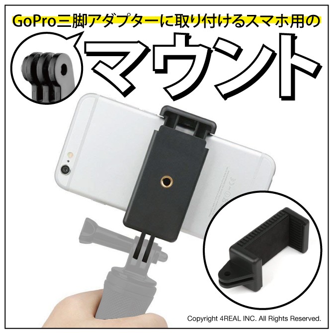 GoProアダプター付きの三脚にスマートフォンが簡単に取り付けできるクリップです。