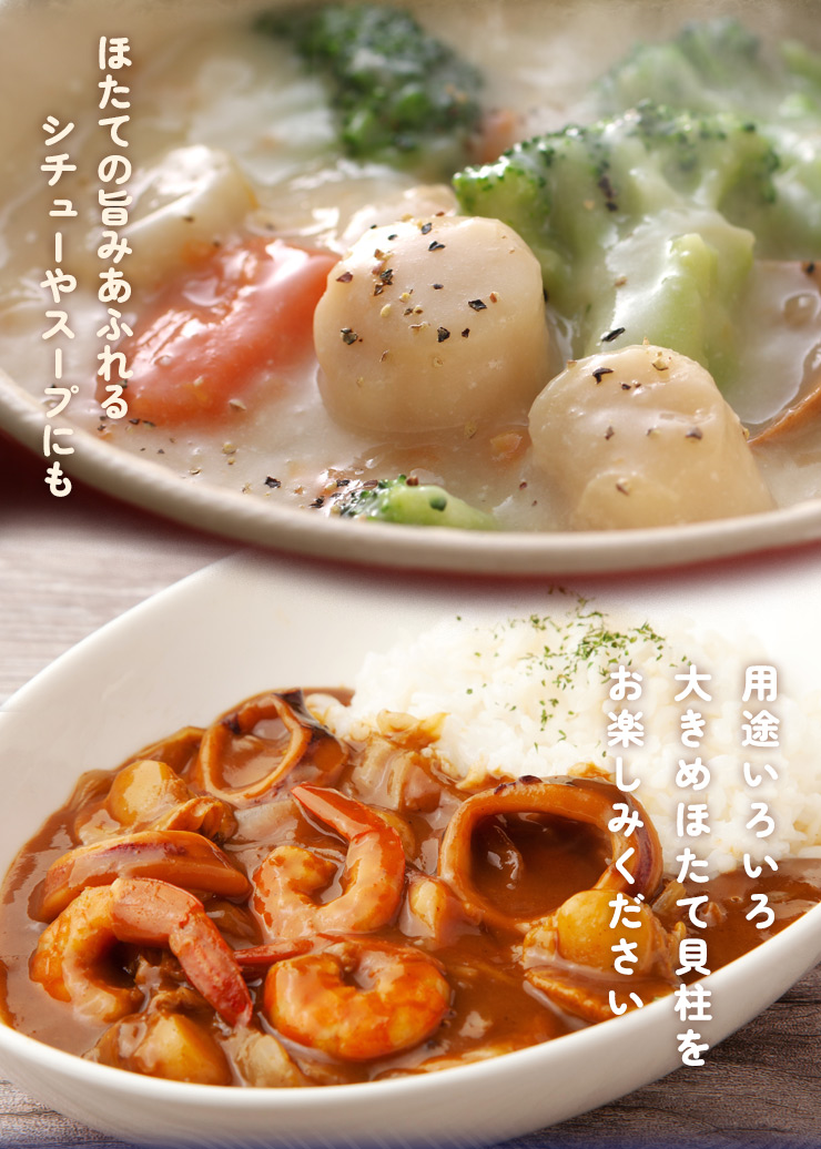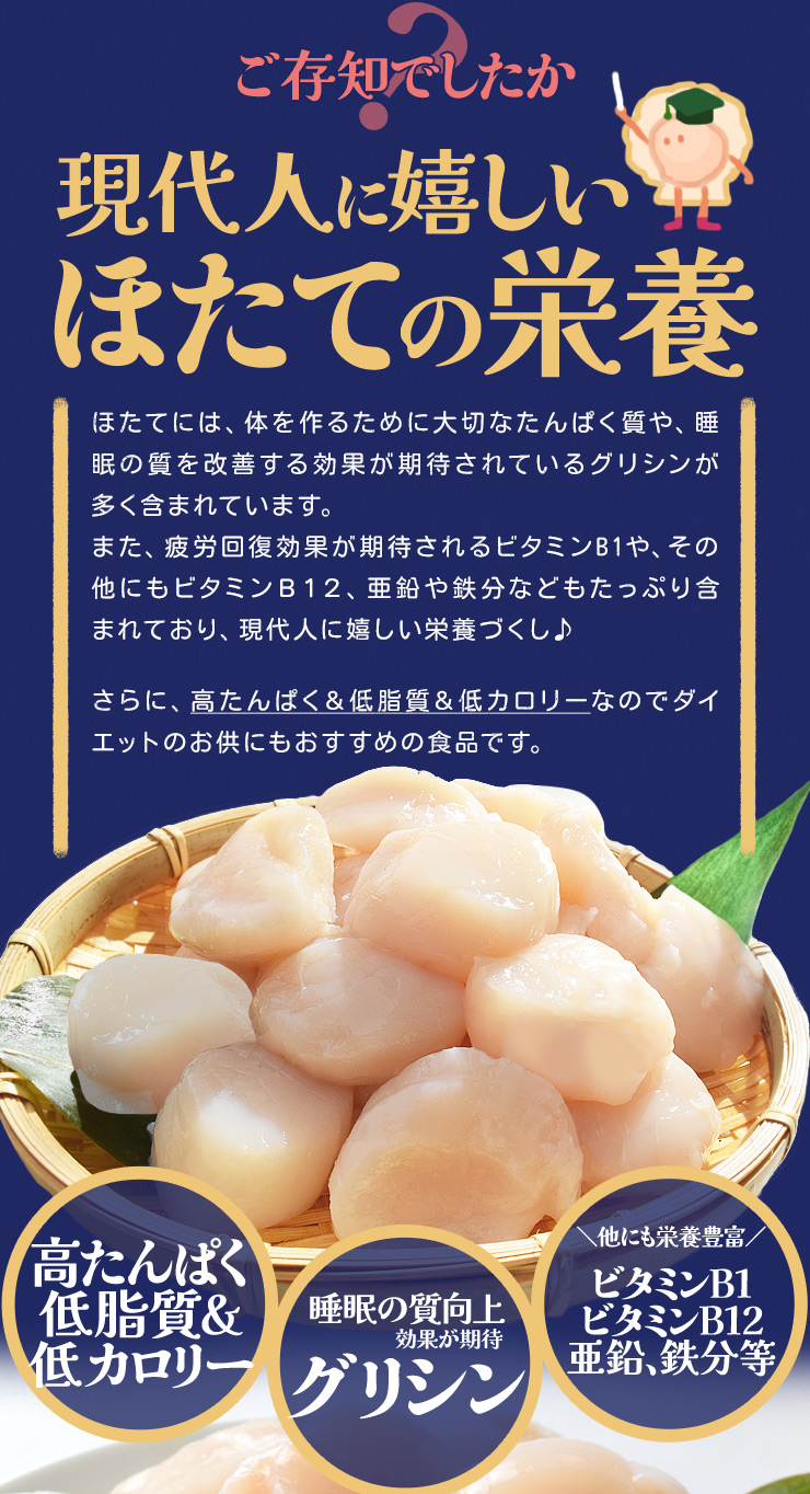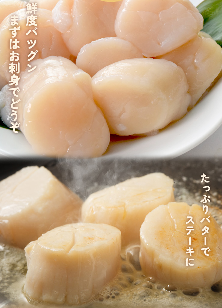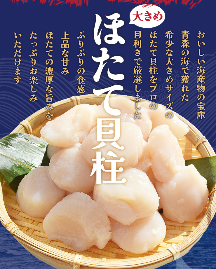 ホタテ 貝柱 トップクラスのホタテ産地青森県で獲れた、希少な大きめサイズの特選ランクほたて貝柱。ぷりぷり食感と濃厚な旨みをお楽しみください