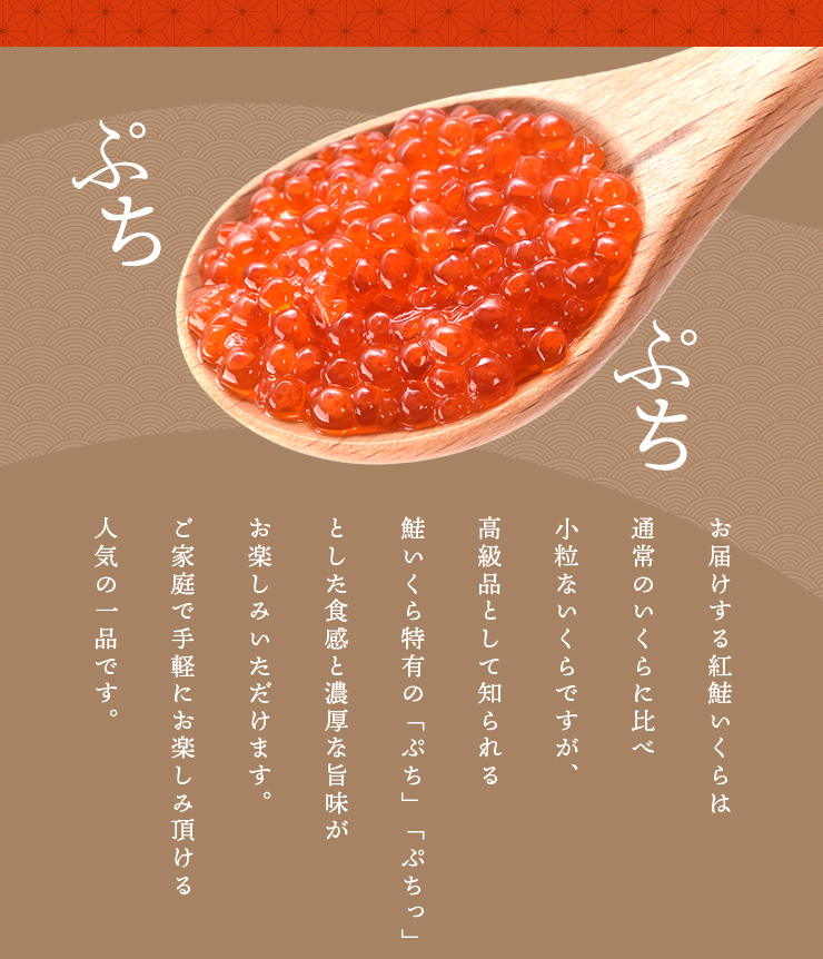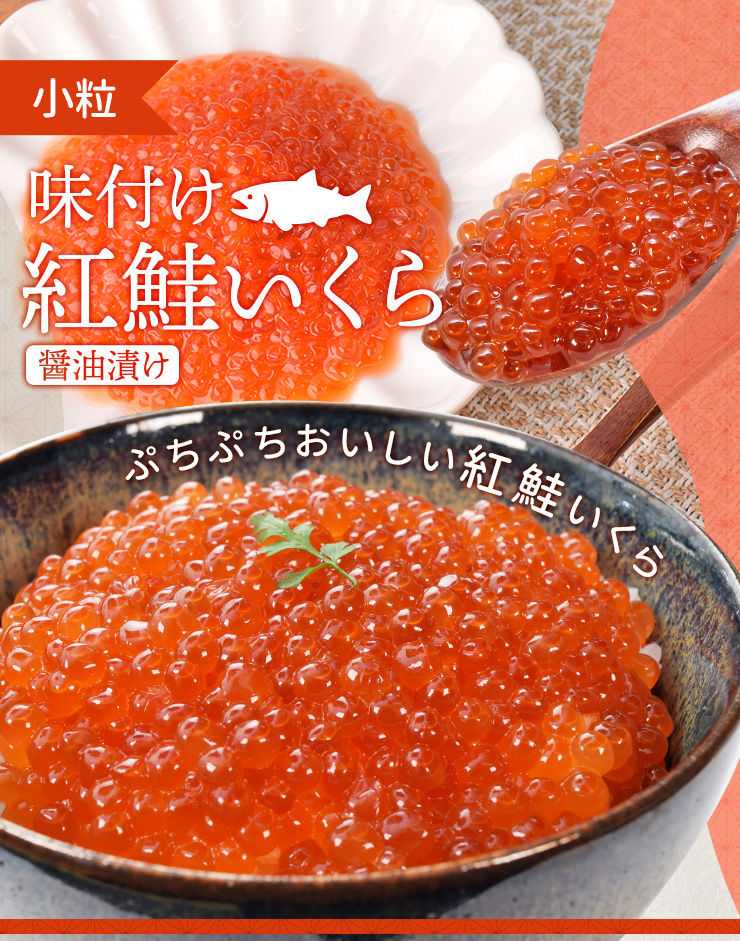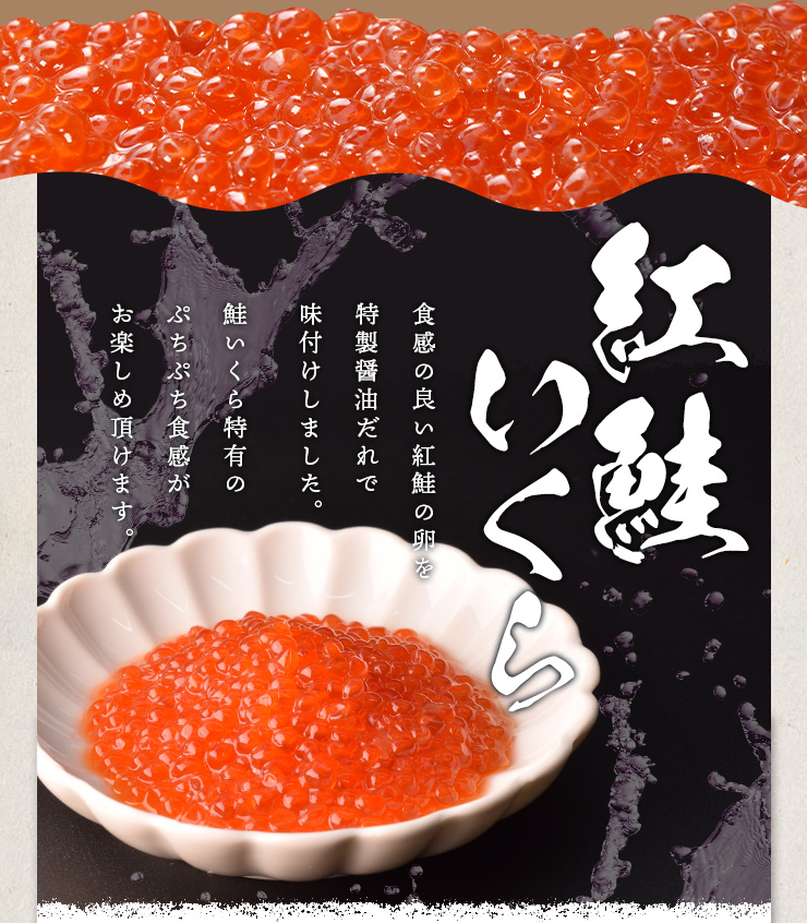 | 原材料名 | 紅鮭卵(いくらを含む)(アメリカ産)、発酵調味料、粉末水あめ、本みりん、しょうゆ(大豆・小麦を含む)、食塩、リンゴ酢(りんごを含む)、砂糖、昆布エキス(小麦を含む)、カツオエキス、たん白加水分解物(大豆・小麦を含む)、チキンエキス(鶏肉を含む)/調味料(アミノ酸等)、甘味料(ソルビトール)、増粘剤(キサンタンガム、CMC、グァーガム) |