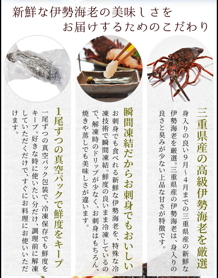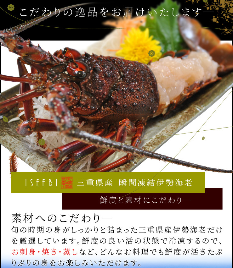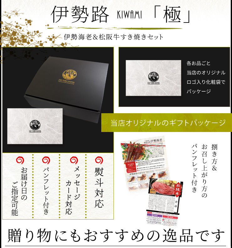 | 内容量 | 松阪牛特選すき焼き肉 300g 三重県産瞬間冷凍伊勢海老 200g×2尾 |