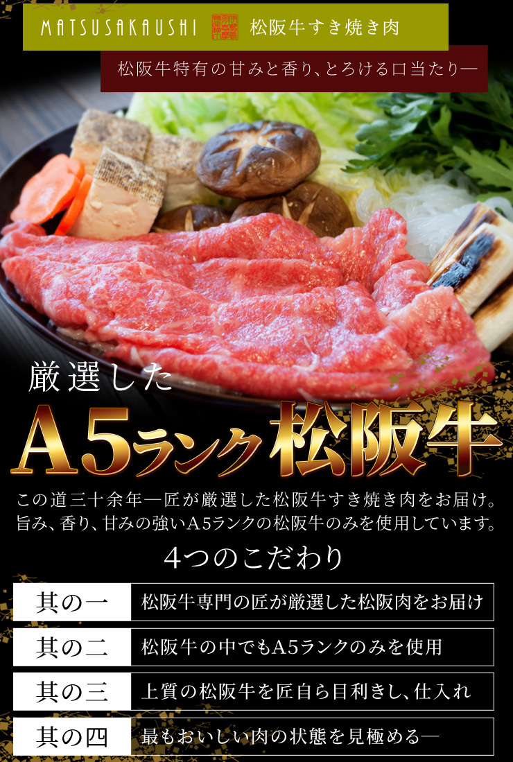 | 商品名 | A5ランク厳選松阪牛特選すき焼き肉300g と 三重県産瞬間冷凍伊勢海老200g×2尾詰合せ |