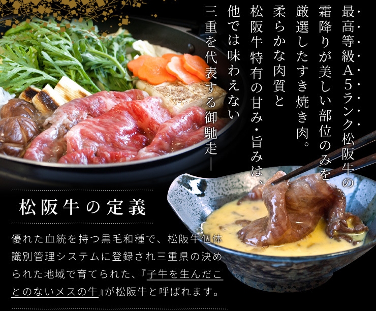 | 商品説明 | 三重県を代表する特産品 松阪牛と伊勢海老の豪華詰合せです。霜降りの白と赤身の赤が紅白で縁起が良いとされる松阪牛と長寿のシンボル伊勢海老。贈り物やお祝いの品に!松阪牛一筋の匠が厳選したA5ランク厳選の松阪牛の霜降りが鮮やかなすき焼き用松阪肉とお刺身用の三重県産伊勢海老を詰合せしました。 |