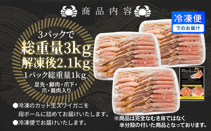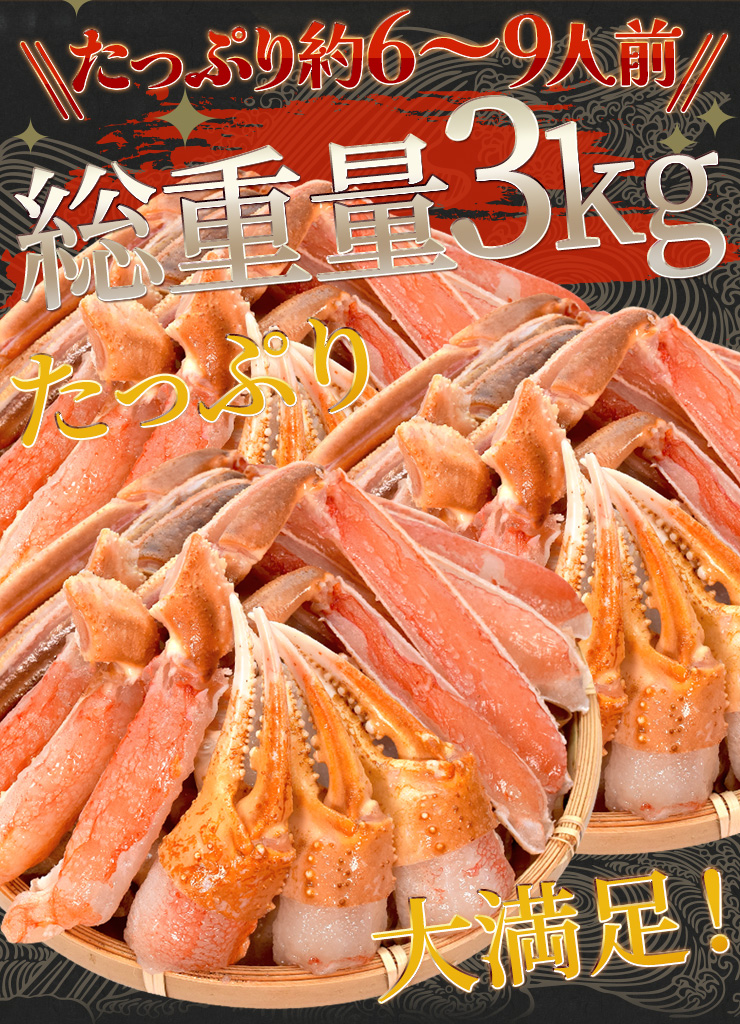 | 内容量 | 3kg前後(正味量約2.1kg) ※カニを保護する氷の重量込み |