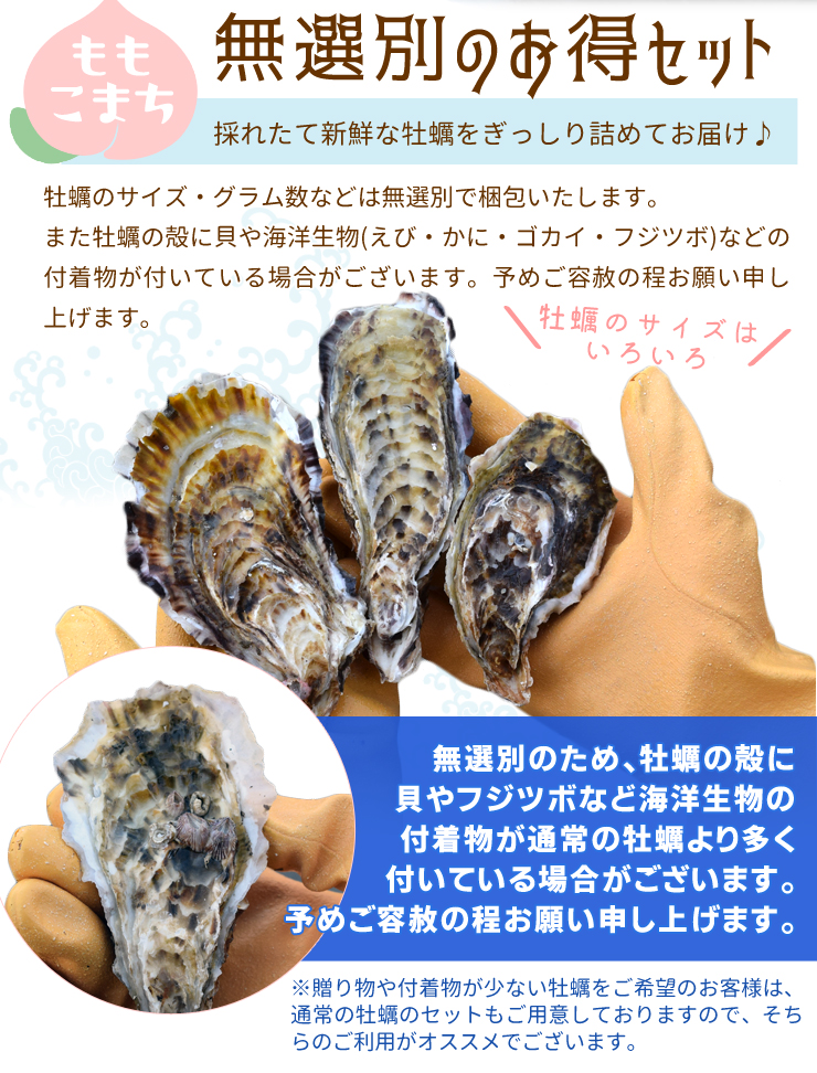SS・S・Mサイズの牡蠣が混ざった無選別牡蠣なのでお買い得。