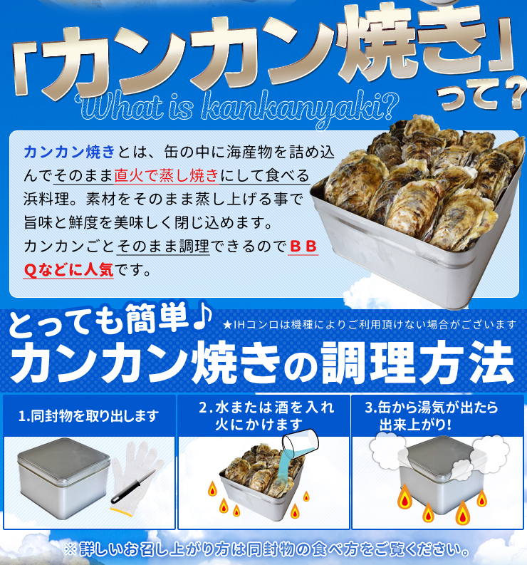 | 商品名 | 殻付き生牡蠣(加熱用)缶入り・牡蠣ナイフ・手袋付 |