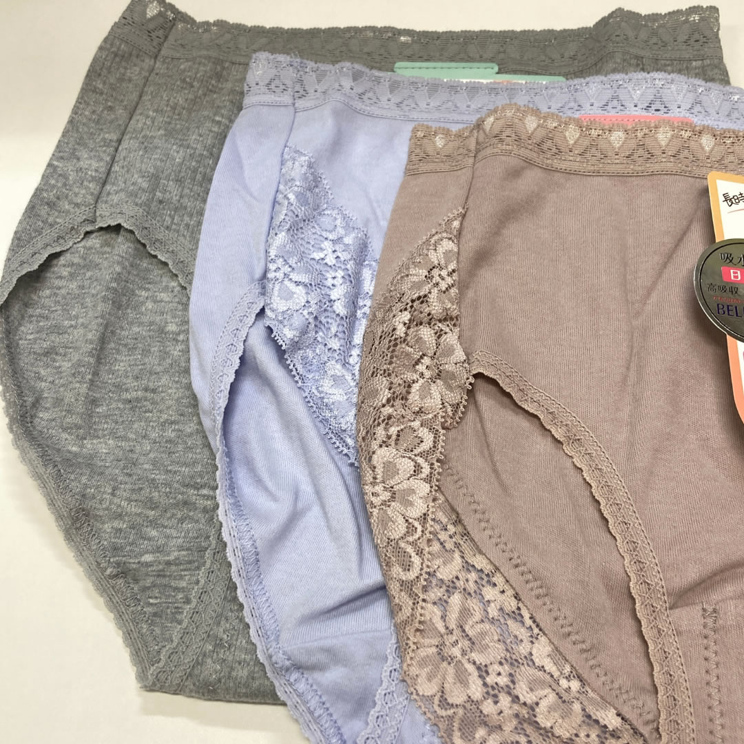 スマイル吸水ショーツは、なめらかな綿100%生地に、それぞれのカラーに合わせたこだわりのスキンケア加工を施しました。