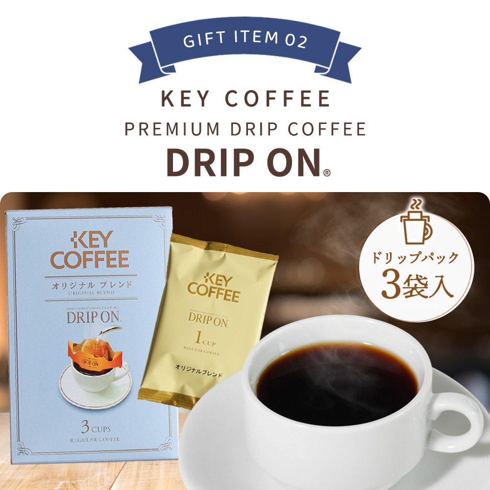 | セット内容 | (1) ソープフラワーブーケ(ジュエリーライト付属)×1 (2) KEY COFFEE DRIP ON レギュラーコーヒー (1杯分ドリップパック 8g×3袋入り) ×1 (3) カフェスイーツ プチケーキ(個包装 マドレーヌ・フィナンシェ・ガトーショコラ各4個) ×1 |